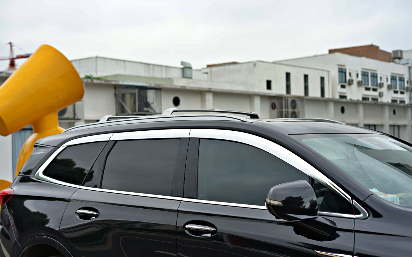 这款韩国进口的ABS铂金电镀雨挡采用八片装设计。一边三个车窗是四片雨挡。A柱位置的细节也很好照顾到