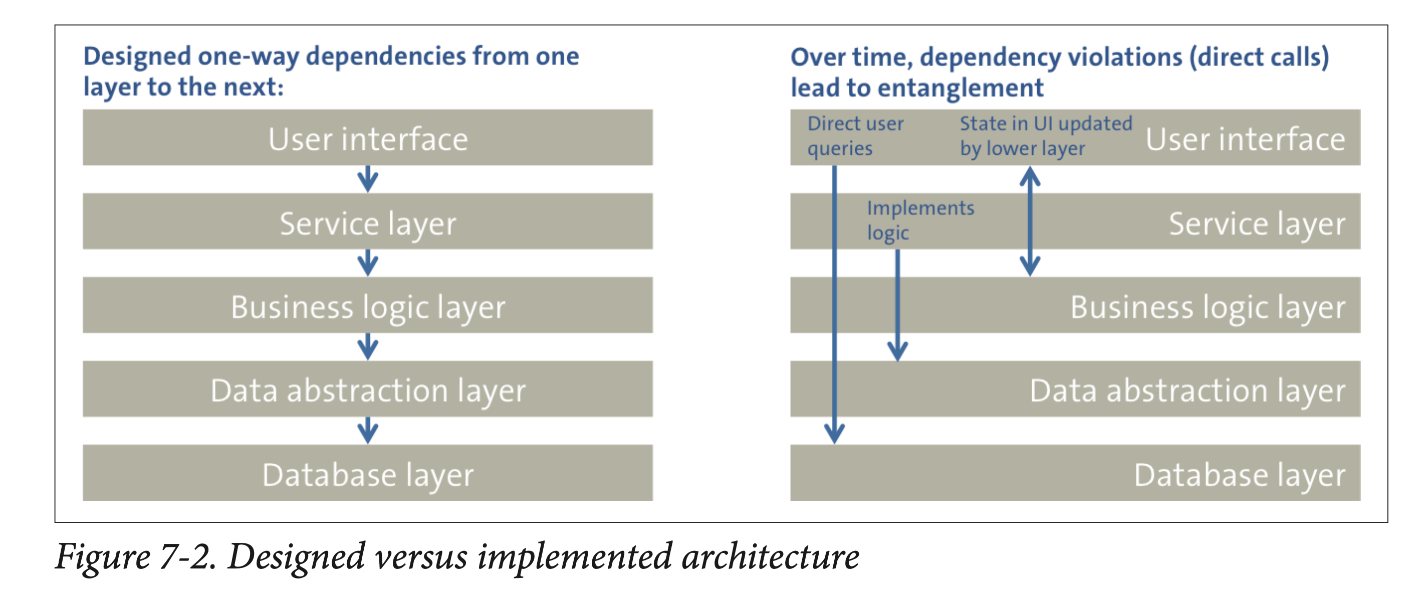 1,最左侧,User interface层,越过多个层,直接访问Database layer,违反上面第二条规则。