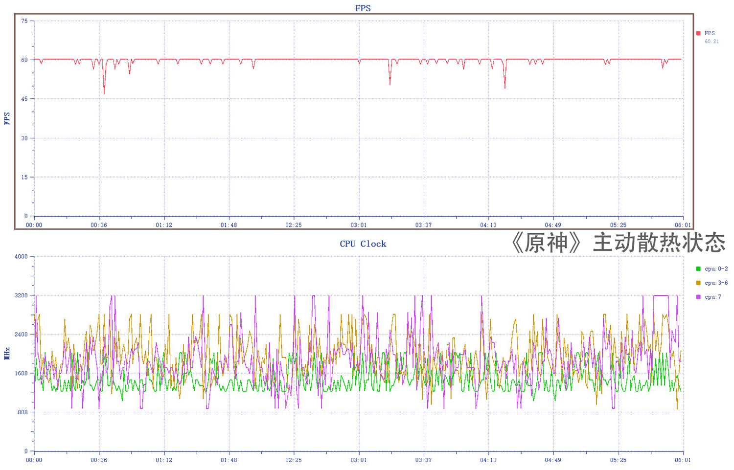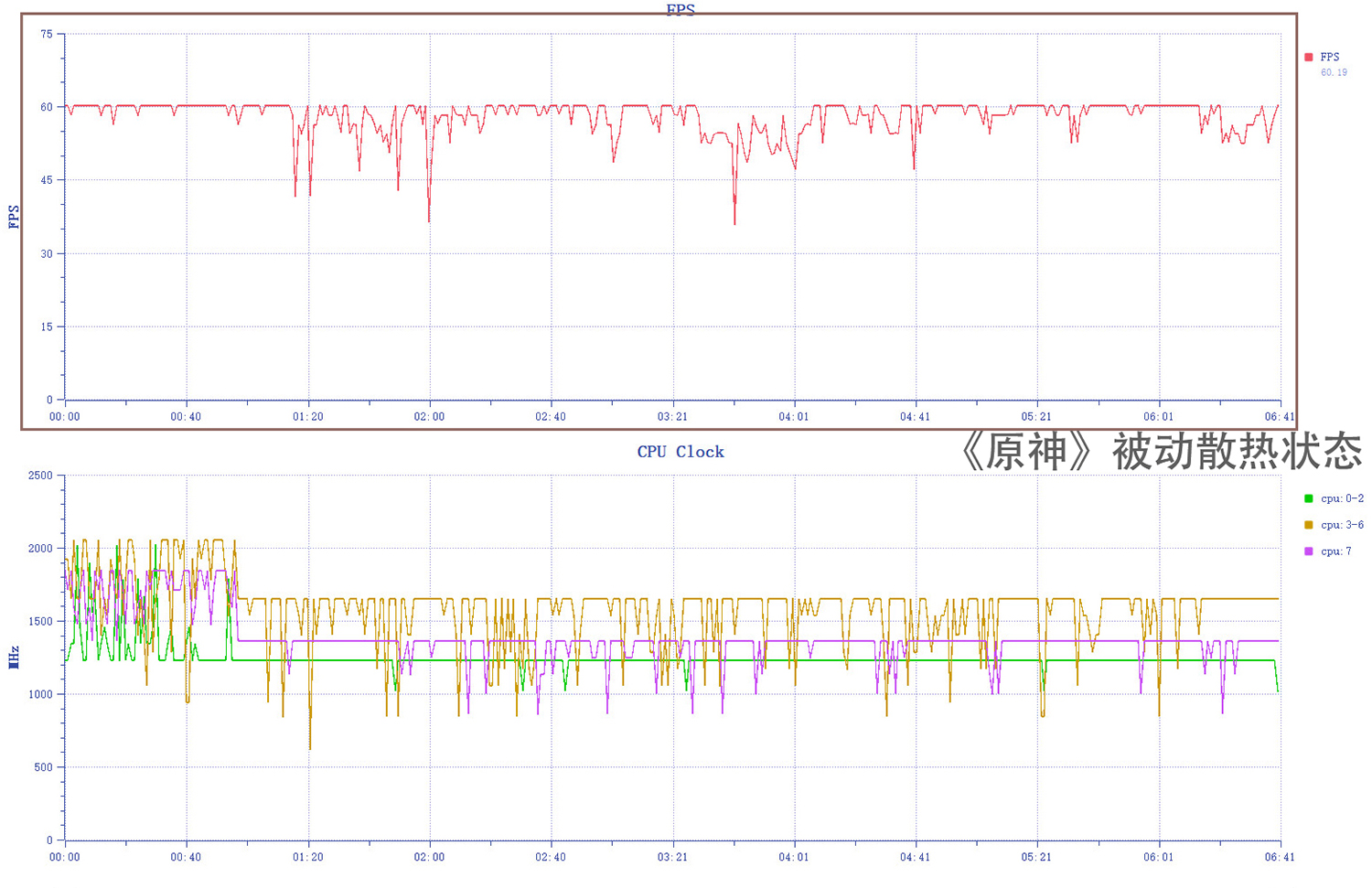 手机在自然散热状态下,由于前期经过更新数据与载入数据,当进入游戏后CPU一分钟不到就开始降频,X3大核频率降至1.7GHz左右,对游戏帧数稳定性的影响十分明显,虽然游戏场景下可以到60FPS,不过当跑图或释放技能时便会出现卡顿掉帧。