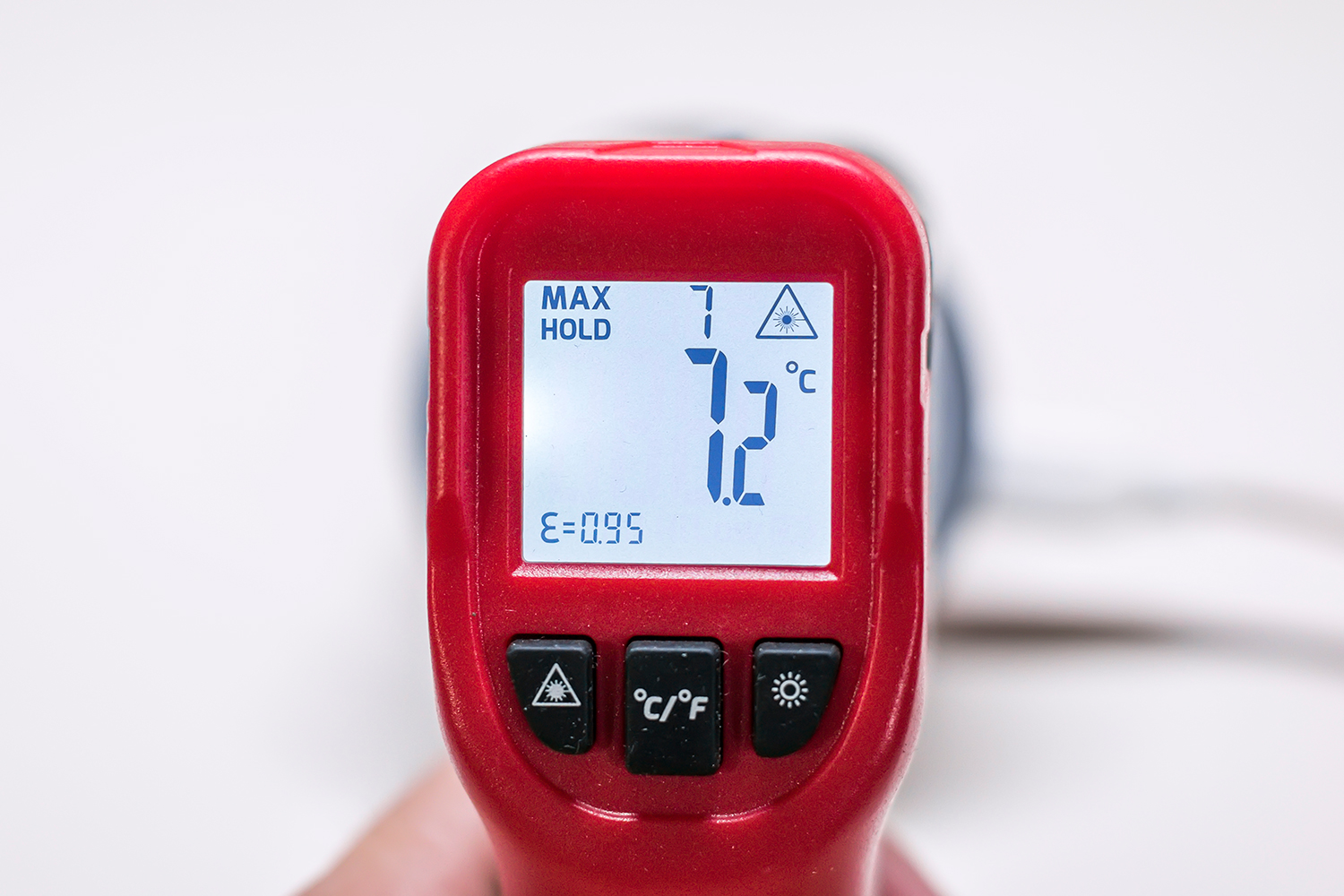 在空载运行十五分钟后,利用红外测温仪对表面进行测量,测得表面温度为7.2℃,在测试时环境温度为32℃,并无开启空调风扇等降温电器,降温幅度接近25℃,虽然没做到厂商所标称的35℃降温幅度,但对于一款20W的手机散热器来说已是相当不错。