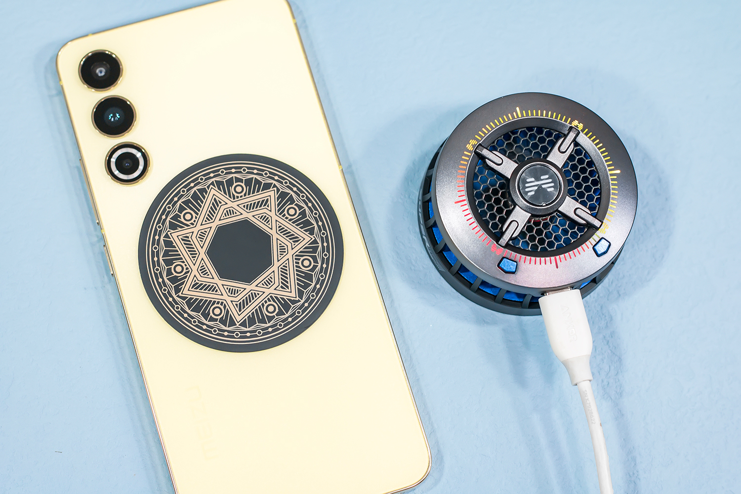 假如是手机自身配备磁吸功能,那么无需安装随机附带的强磁贴片,比如iPhone 12/13/14系列的手机,可直接将散热器吸附到手机背面的相应位置,而安卓平台仅少有数款机型配备磁吸功能,比如这台魅族20手机就需要强磁贴片来辅助固定散热器。