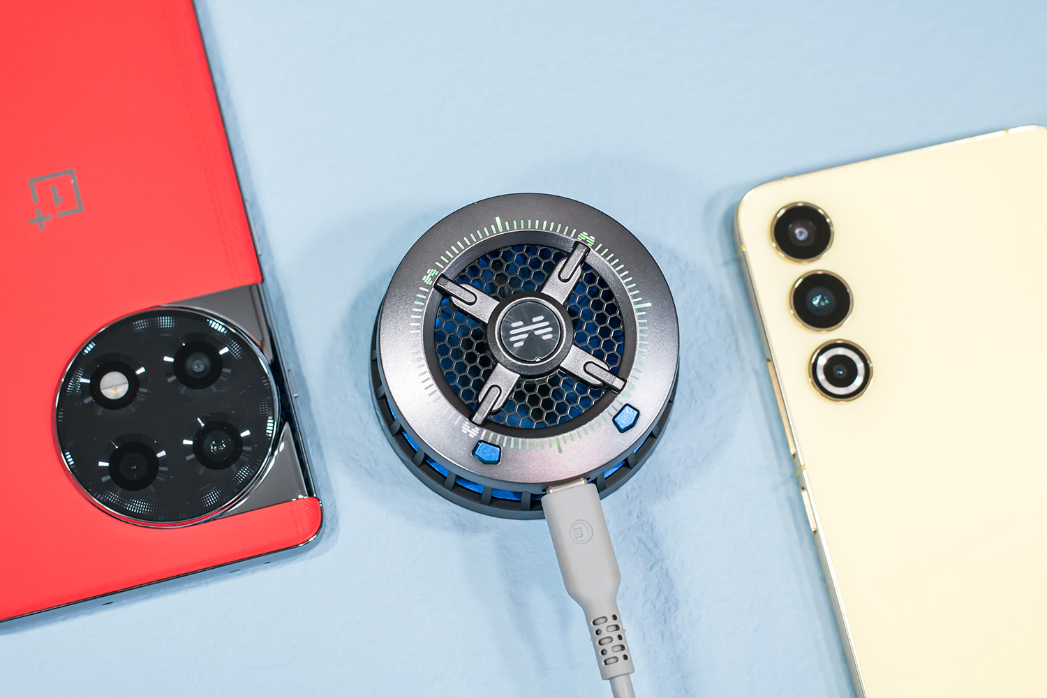 机身的底部覆盖了导热硅胶垫,表面光滑触感细腻柔软,手机散热器内置了一块功率为20W的40×40mm大尺寸半导体制冷片,并利用导热凝胶填补制冷片与导热硅胶垫之间的间隙,使得传导效率更高,搭配高速风扇与散热铝柱快速导出热量。
