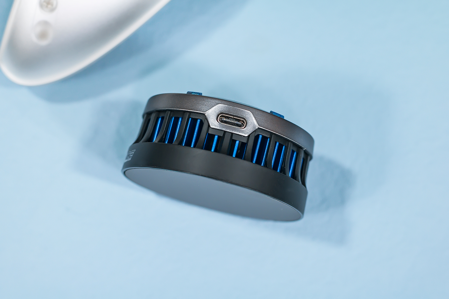 机身底部为USB-C电源输入接口,散热器的运行功率可达20W,实测输出5V/2A的充电器也能为其供电,风扇与灯效均可正常运转,只是实际制冷效果聊胜于无,因此建议搭配输出功率20W以上支持PD快充协议的充电器或移动电源使用。