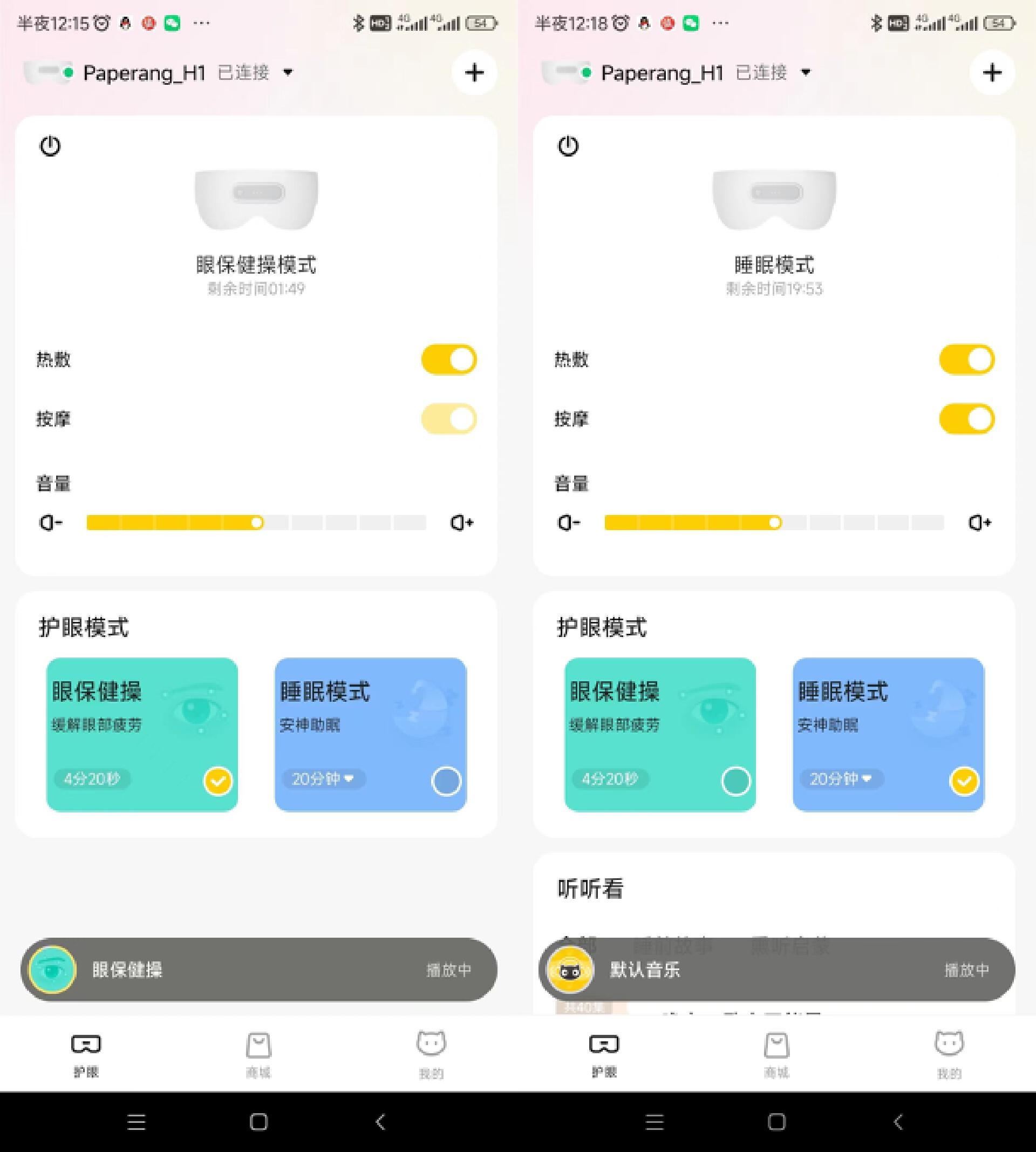 这款喵喵机儿童护眼仪采用蓝牙的方式与手机APP端进行互联的,过程很简单,这里就不详解了。直接来看下APP端的功能吧。进入主界面可以看到护眼模式分为眼保健操和睡眠模式两种。其中眼保健操包含的是08版的眼保健操功能,时长为4分钟20秒。睡眠模式可以起到助眠的作用,时长为20分钟。不同的模式下,热敷、按摩和音量都是可以调节的,非常人性化。