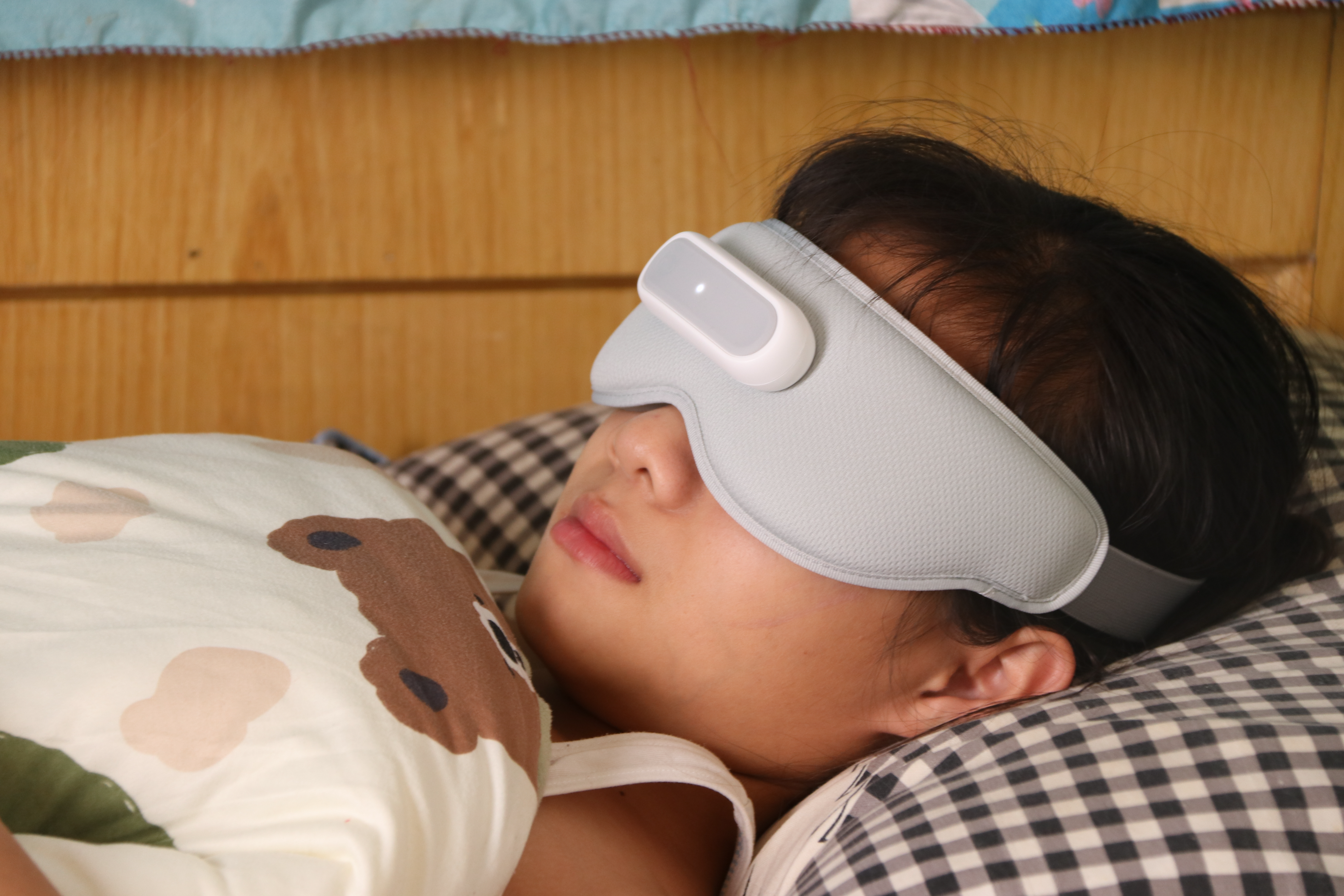 佩戴的固定方式采用的是魔术贴松紧设计,头围大小可调。在凸起的边框上面可以看到有8个凸起的圆点,这里面内置了8颗振子马达,正好覆盖眼保健操的4大关键穴位,结合NTC精准控温,可让眼部按摩和热敷同时进行。