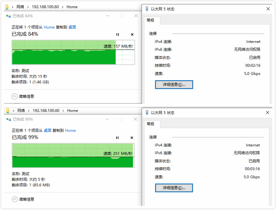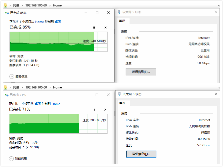在开启SSD缓存加速后,搭配绿联USB-C转RJ45 5G网卡连接下,连接速率为5Gbps时。实测读写速度为240MB/s、写入速度为283MB/s。