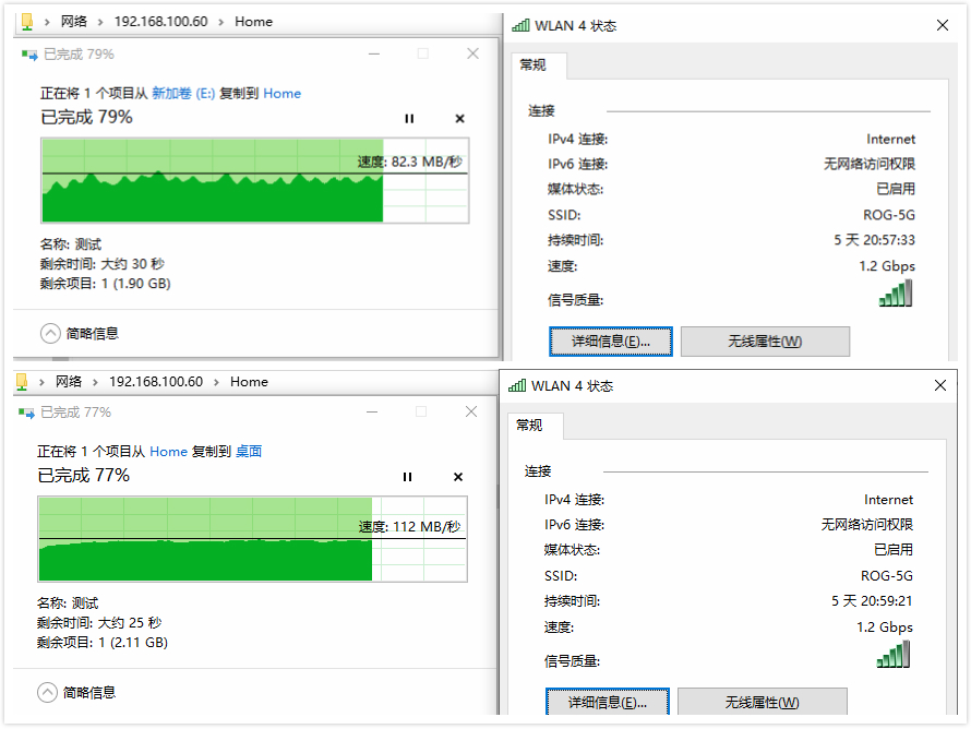 在AX200无线网卡连接下,连接速率为1.2Gbps。实测读写速度为112MB/s、写入速度为82.3MB/s。