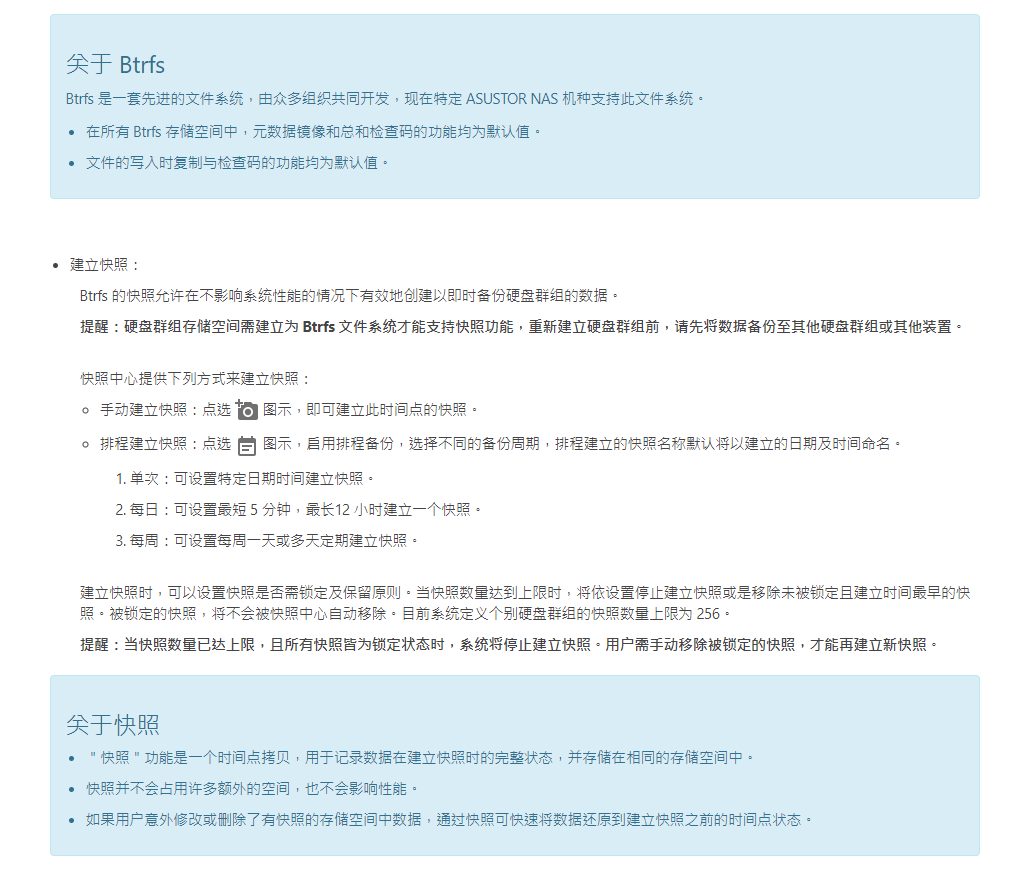 关于硬盘存储模式的选择上,我是推荐可以设置为Btrfs模式,这个模式下支持快照功能,可以为你的数据提供更好的保护。具体介绍可以参考下图内容。