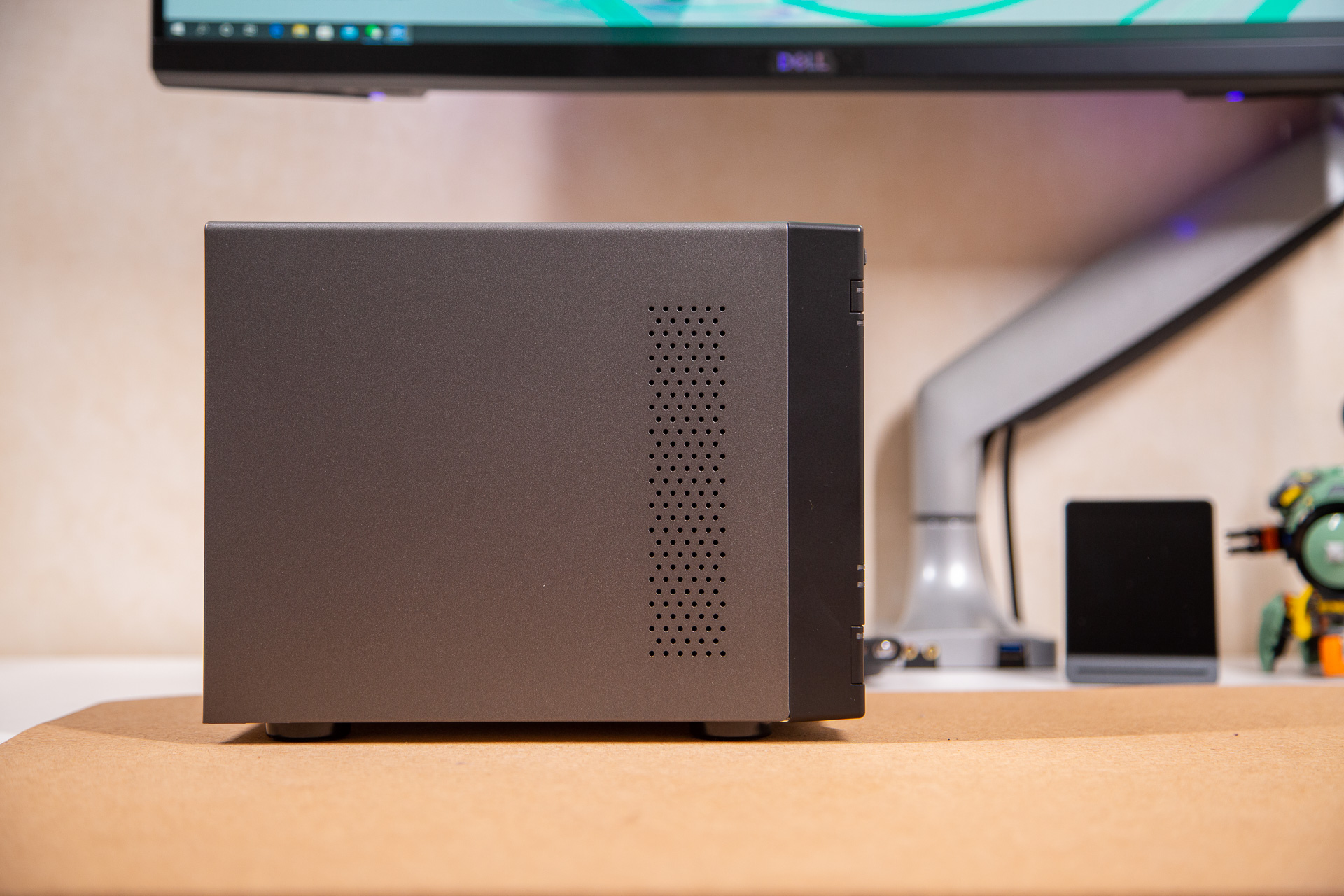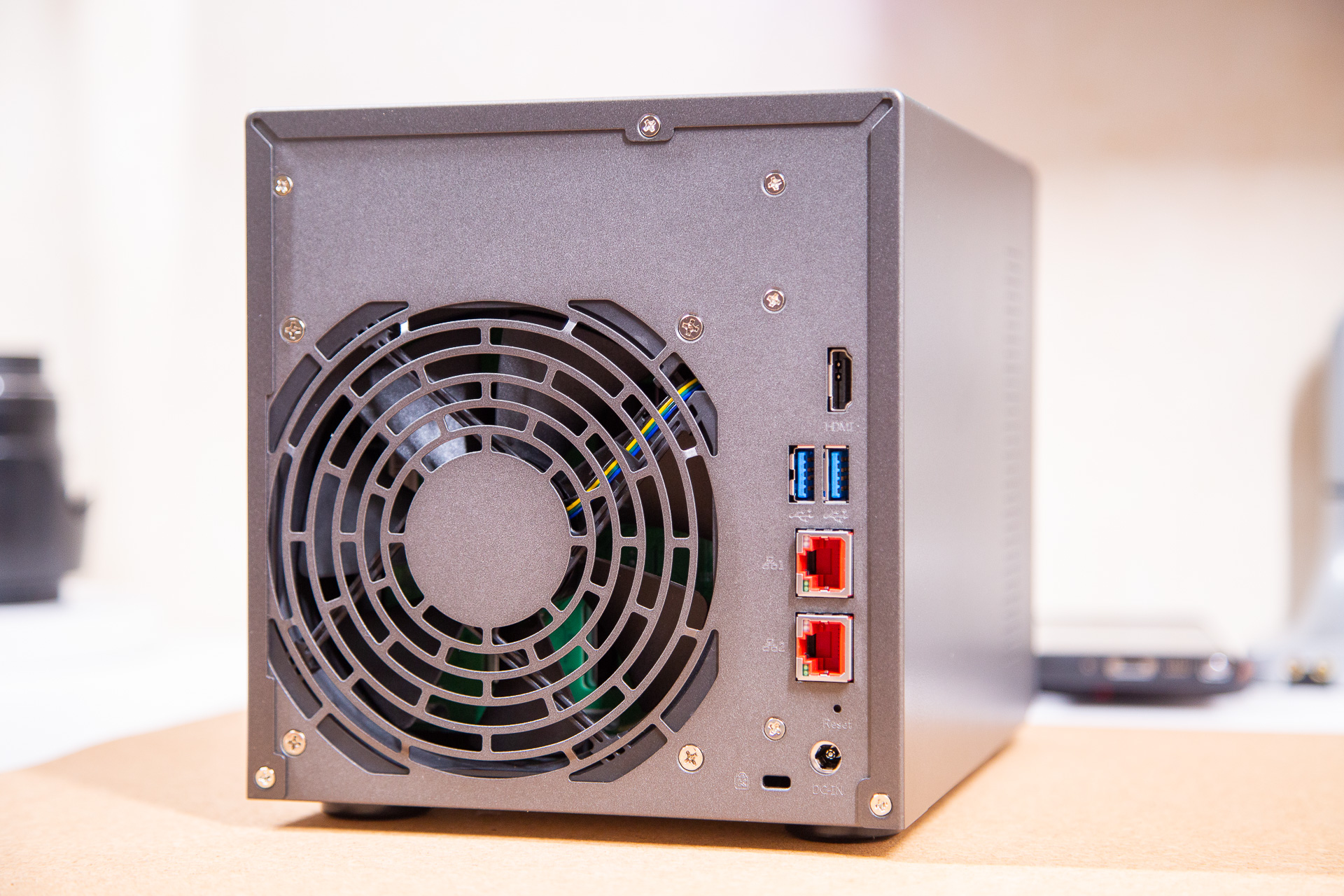 丰富的I/O接口为这款NAS提供了不错的扩展性,在12cm风扇一侧从上至下依次是HDMI2.0接口、两个USB3.2 Gen1 Type-A接口、两个红色的2.5GbE RJ45接口支持链路聚合、Reset复位针孔以及DC电源接口。