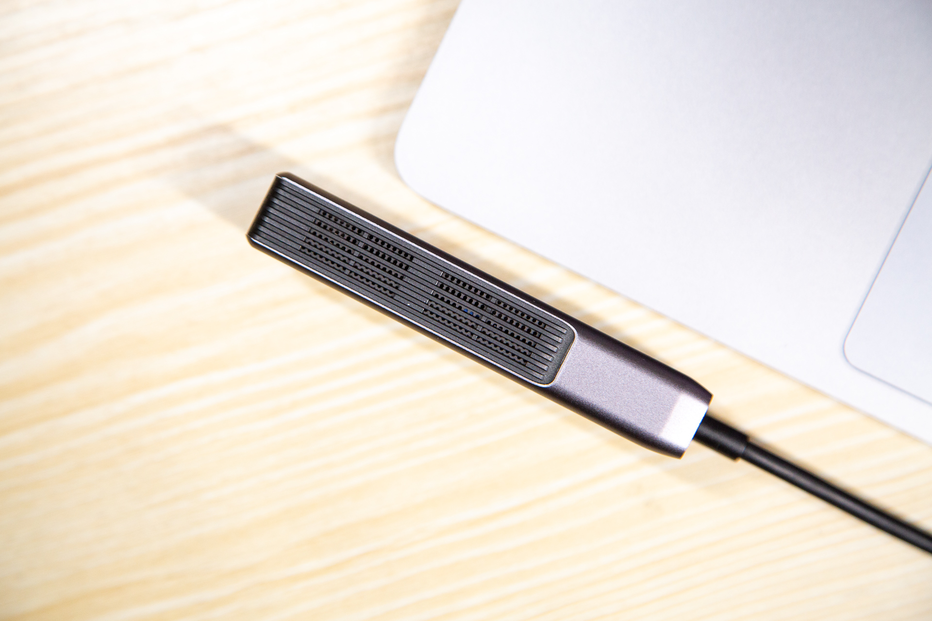 绿联这款USB-C转RJ45 5G网卡采用的是Aquantia AQtion的解决方案,这个方面目前也有很多其他厂商采用。这款USB-C转RJ45 5G网卡体积方面和一般M.2 NVMe的SSD移动硬盘体积相当,采用一体式线材设计。金属的外壳可以帮助散热,不过本身这款设备的发热也不高。