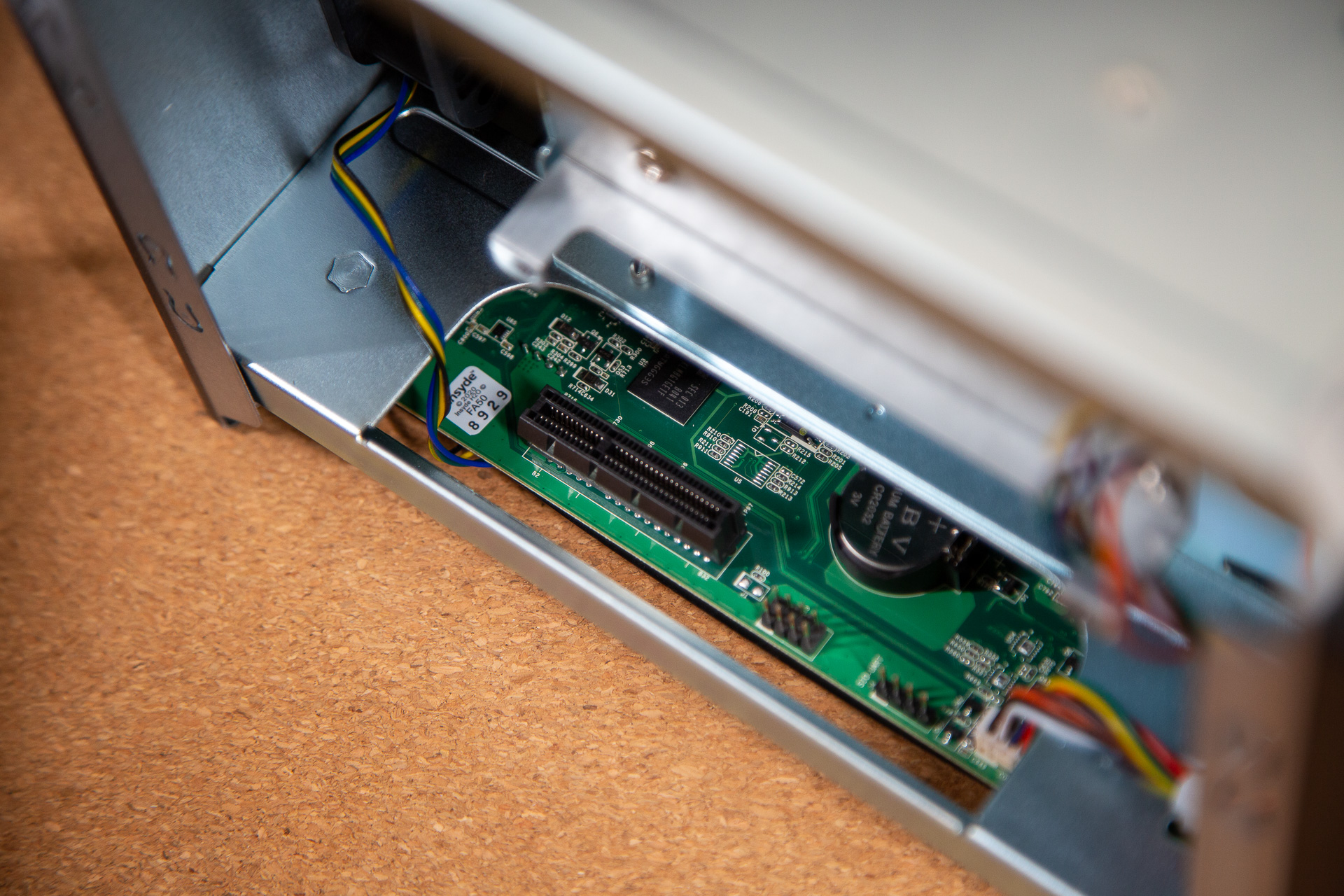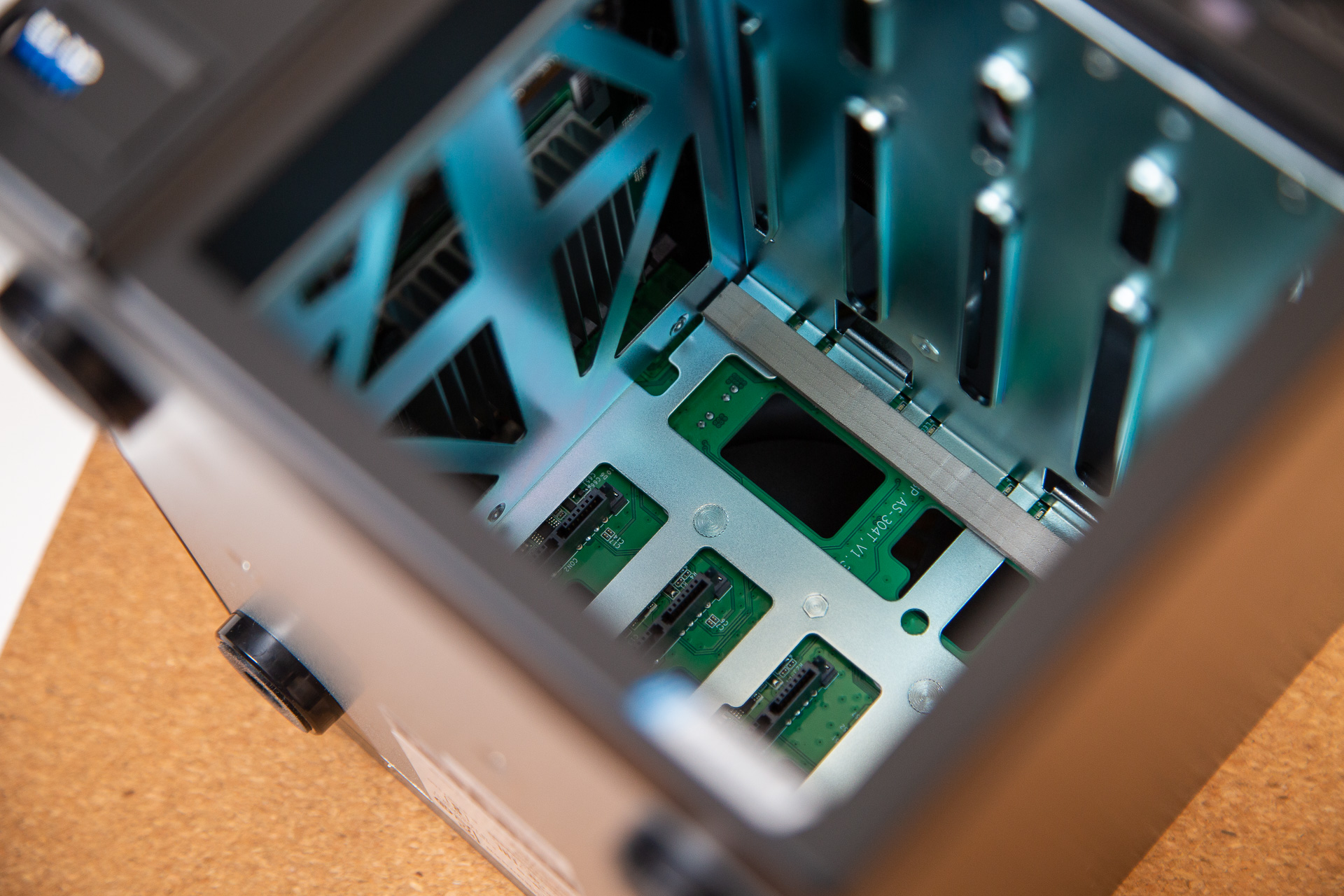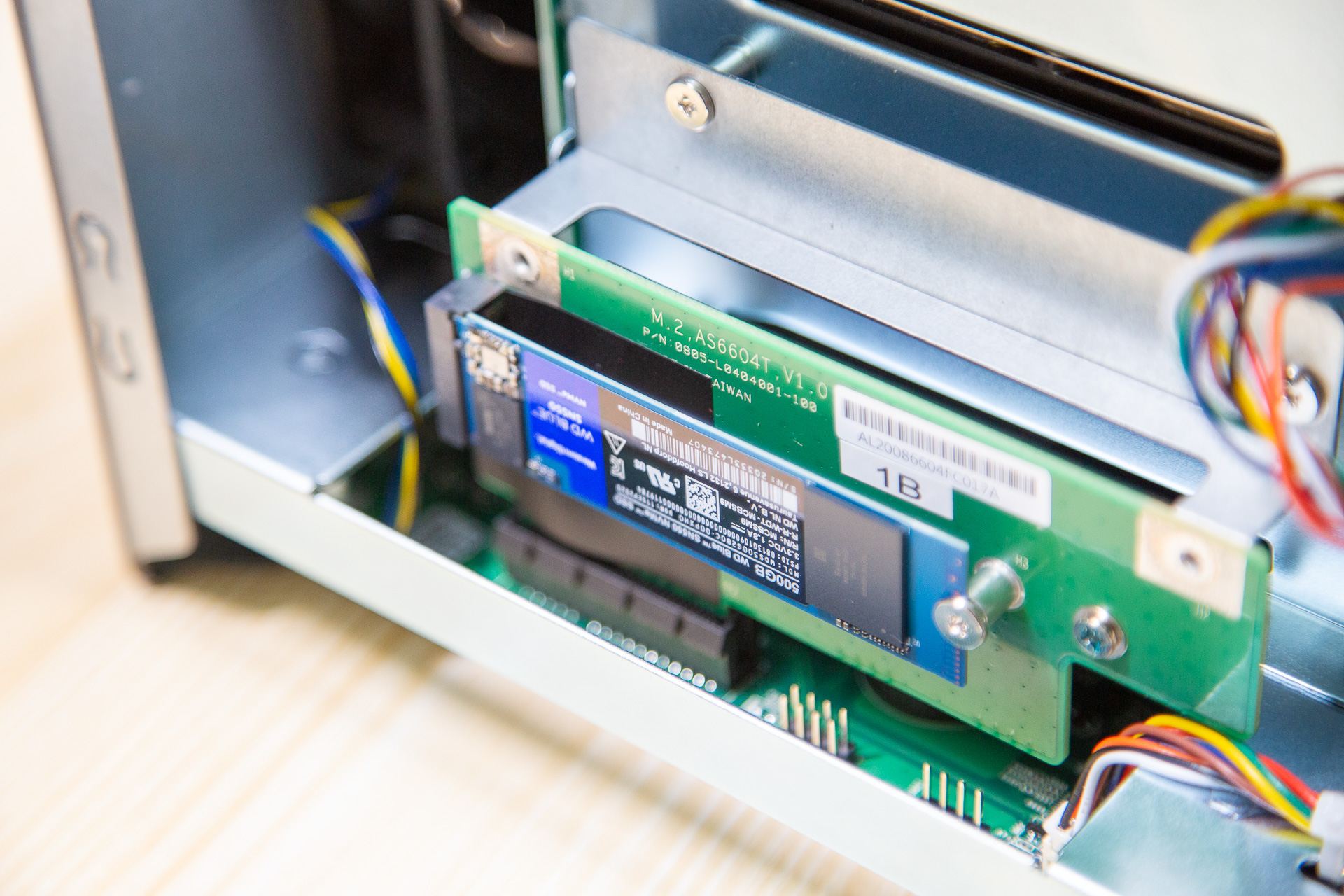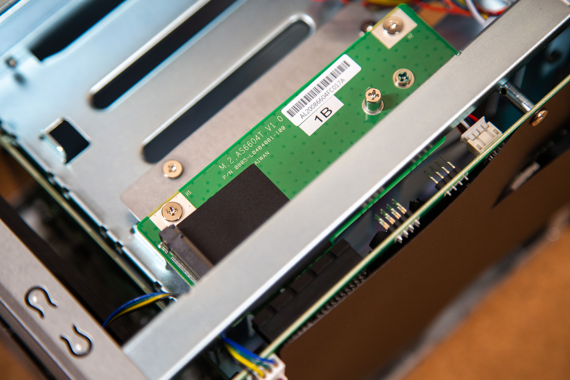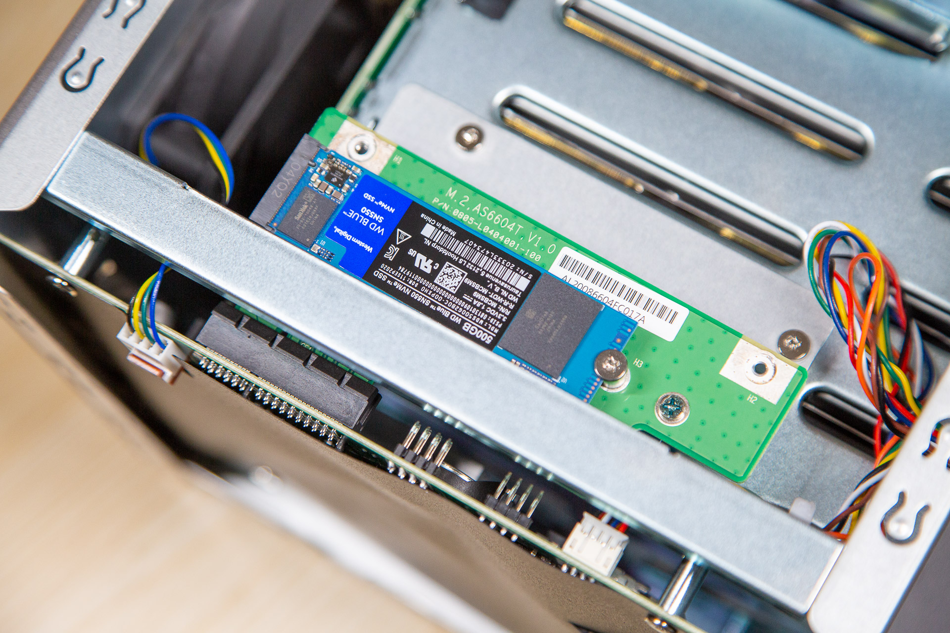 M.2 SSD的安装需要把AS6604T的外壳取下后才能安装,不过也并不麻烦。拆除NAS后面三个接口即可看到内部的M.2安装位置。