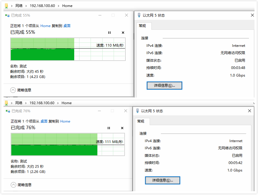 绿联USB-C转RJ45 5G网卡连接下,连接速率为1Gbps时。实测读写速度为111MB/s、写入速度为110MB/s。