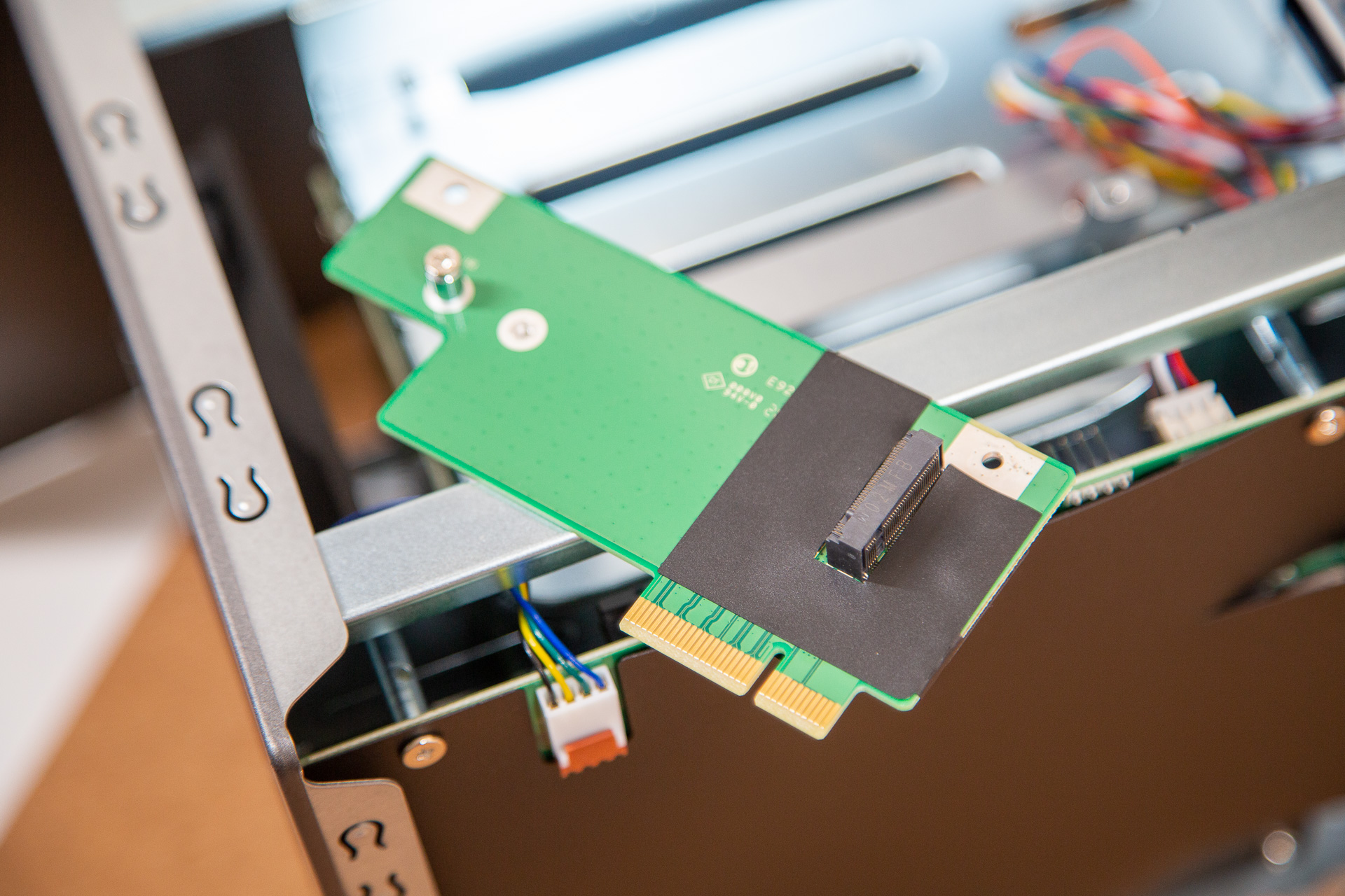 需要注意的是这块PCIe转M.2扩展只能选用支持NVMe SSD产品,实际带宽为PCIe2.0x1。其实在NAS后设计一个半高的PCIe接口就更好了,可以让用选择是扩展M.2或者万兆网络都有一个选择。