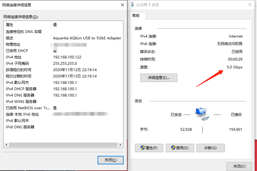 接入Windows系统后接入网线会自动识别,可以看到设备信息网络连接速度都正常显示。连接速度为5Gbps,搭配它与AS6604T刚好合适测试。