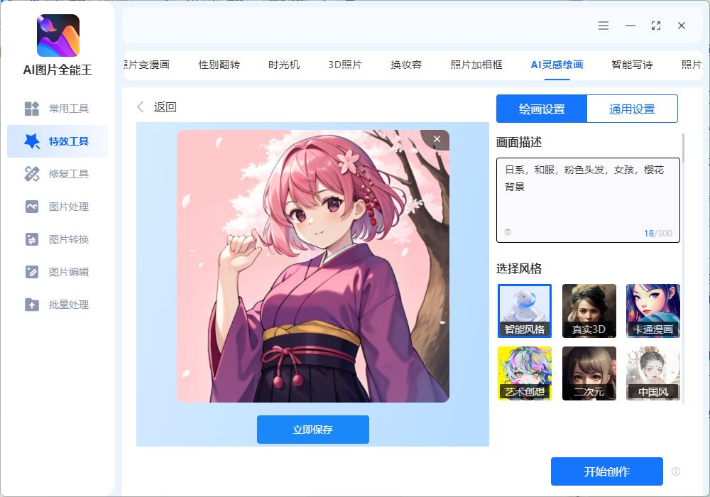 AI图片全能王的AI绘画功能有根据文字生成图片的模式,也有根据图片绘制图画的模式,两种模式画出来的图片质量都很高。