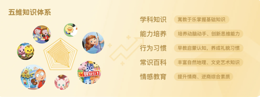 小朋友们可以跟随开心娜娜养成懂礼貌的好习惯,向小伶姐姐学习英文,与动画形象豆乐爷爷了解趣味国学……在五维体系下,儿童各方面素质得到针对性的提升和补充,帮助孩子们拓宽视野。