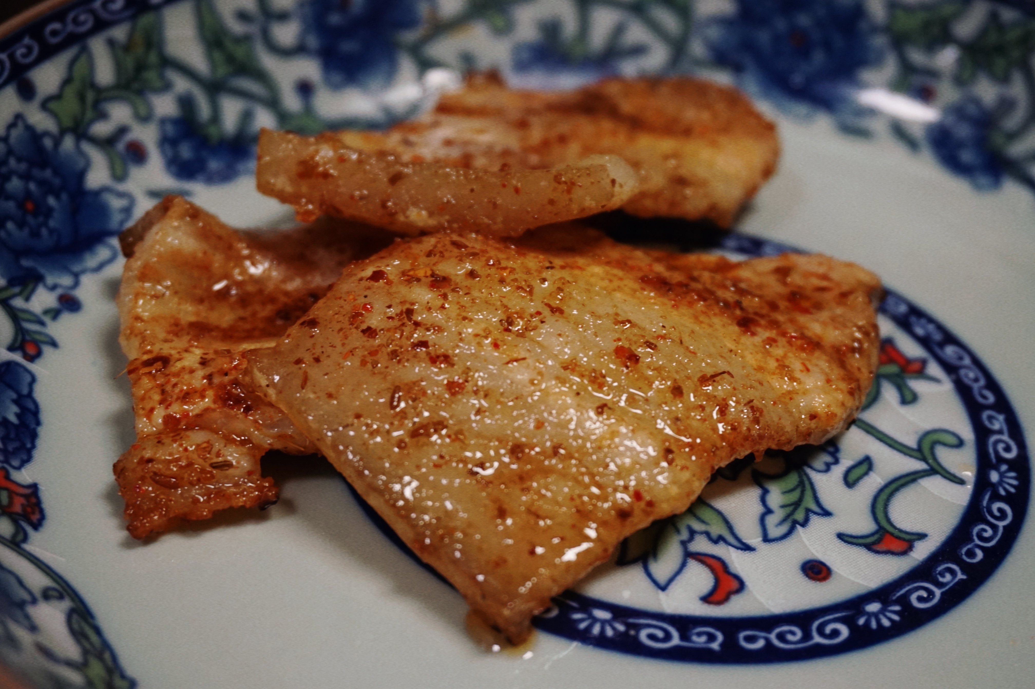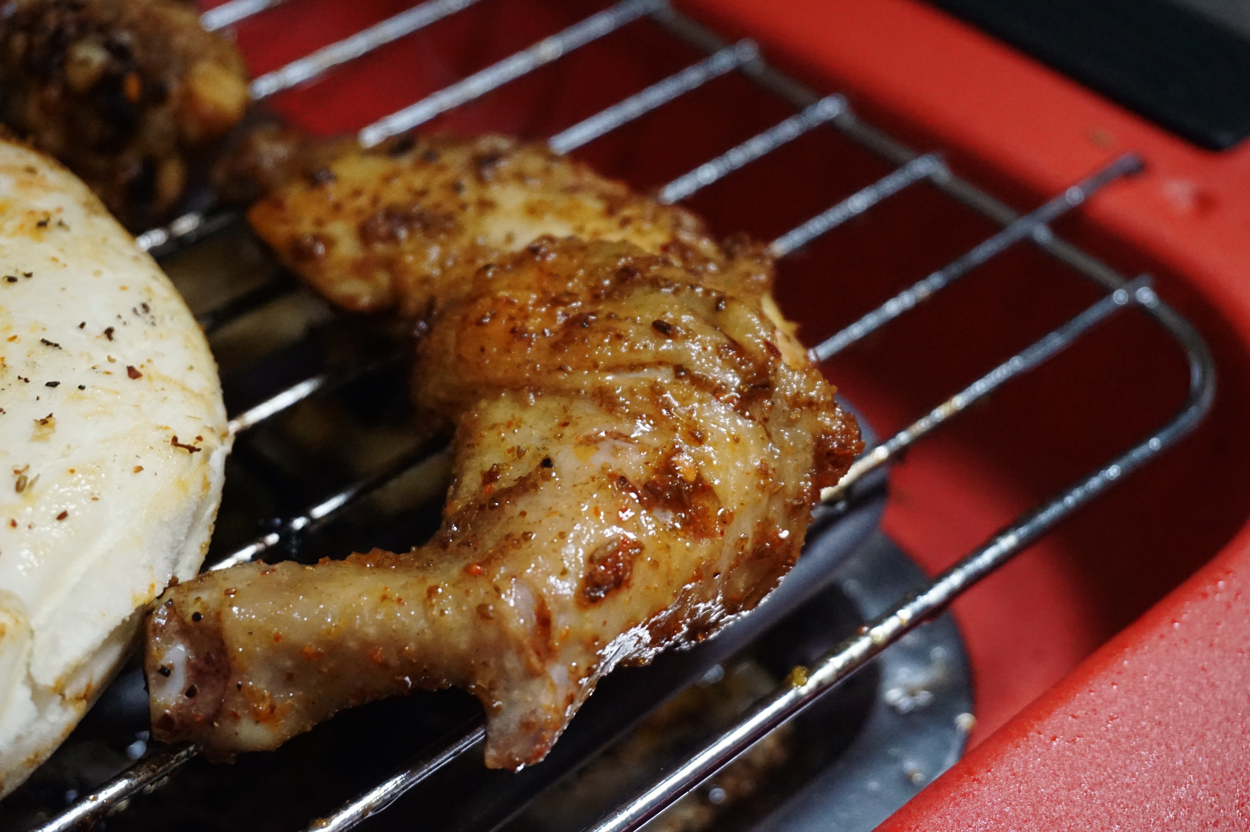 烤鸡腿的效果,肉质软糯,汁水都被牢牢地锁在了肉里。哈哈稍微有点咸,可能腌的有点过了,不过还是非常香的。