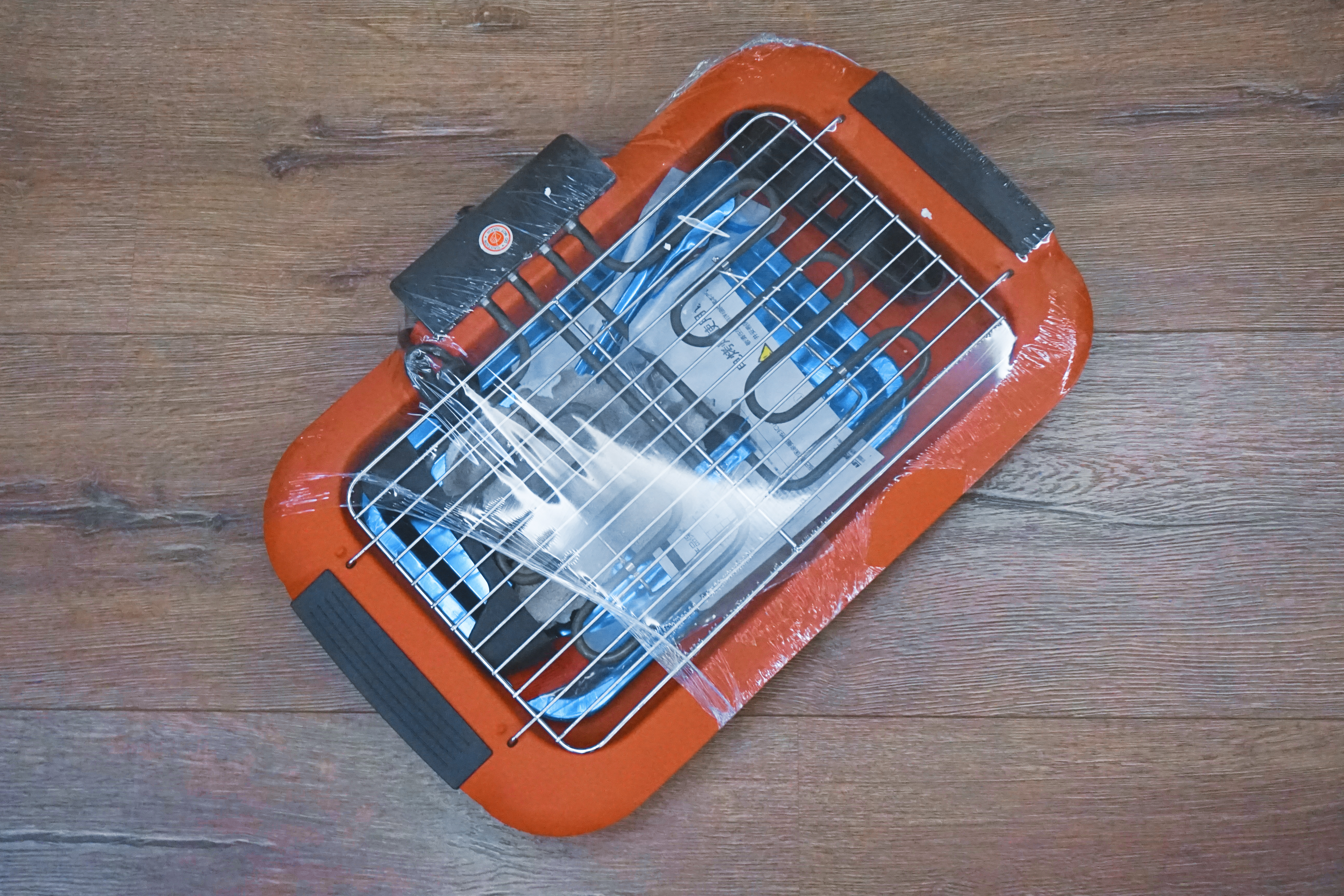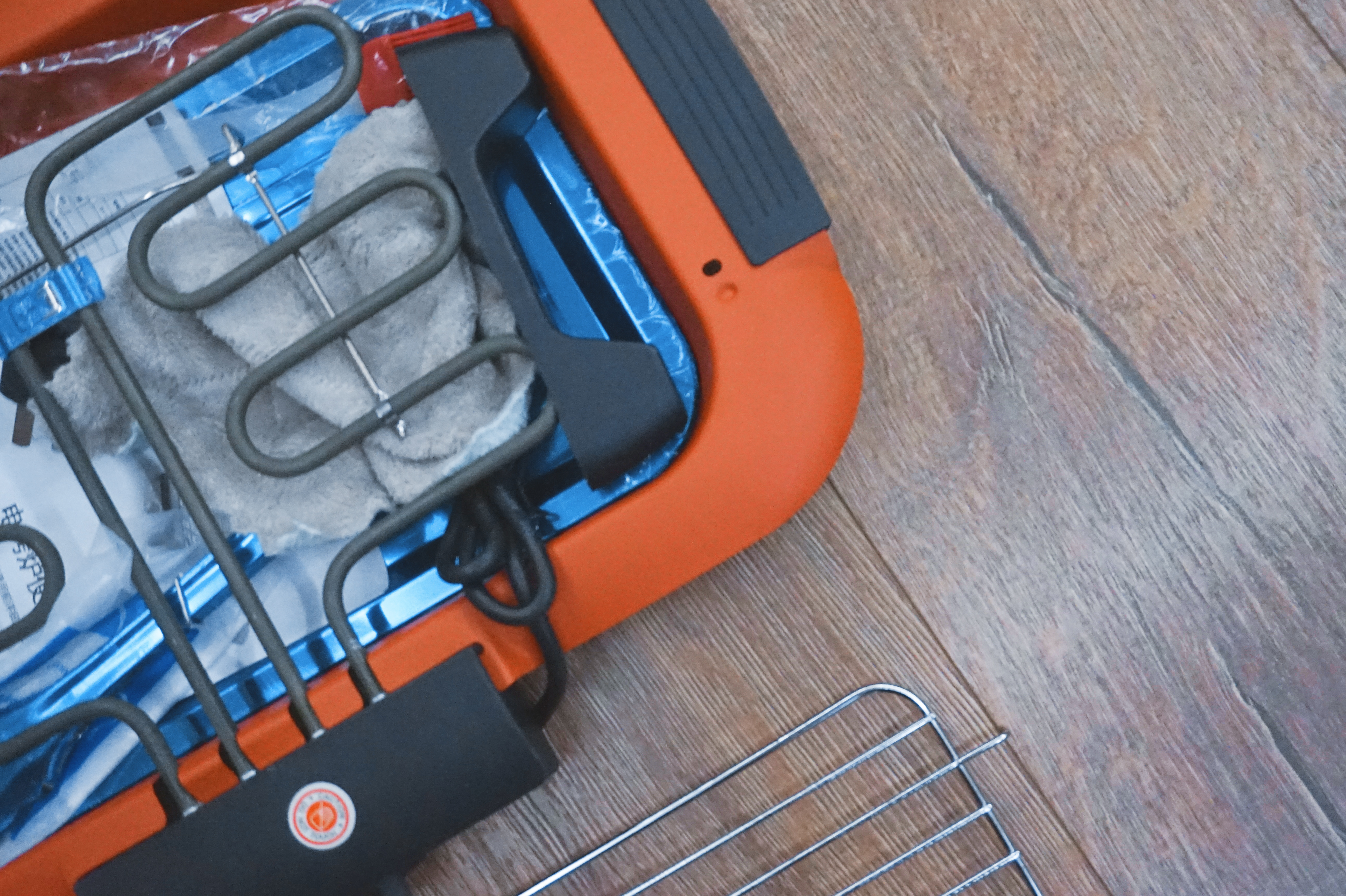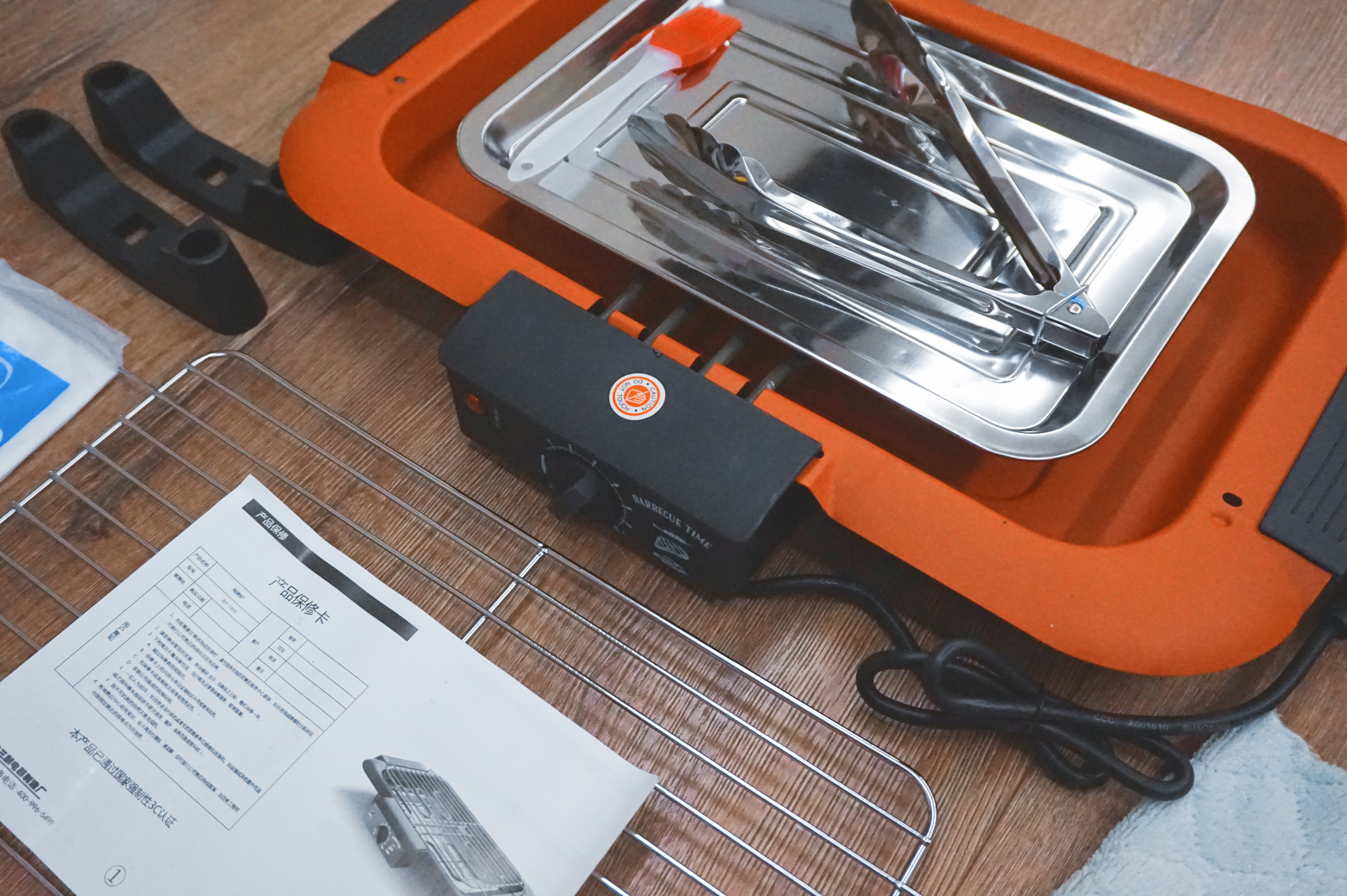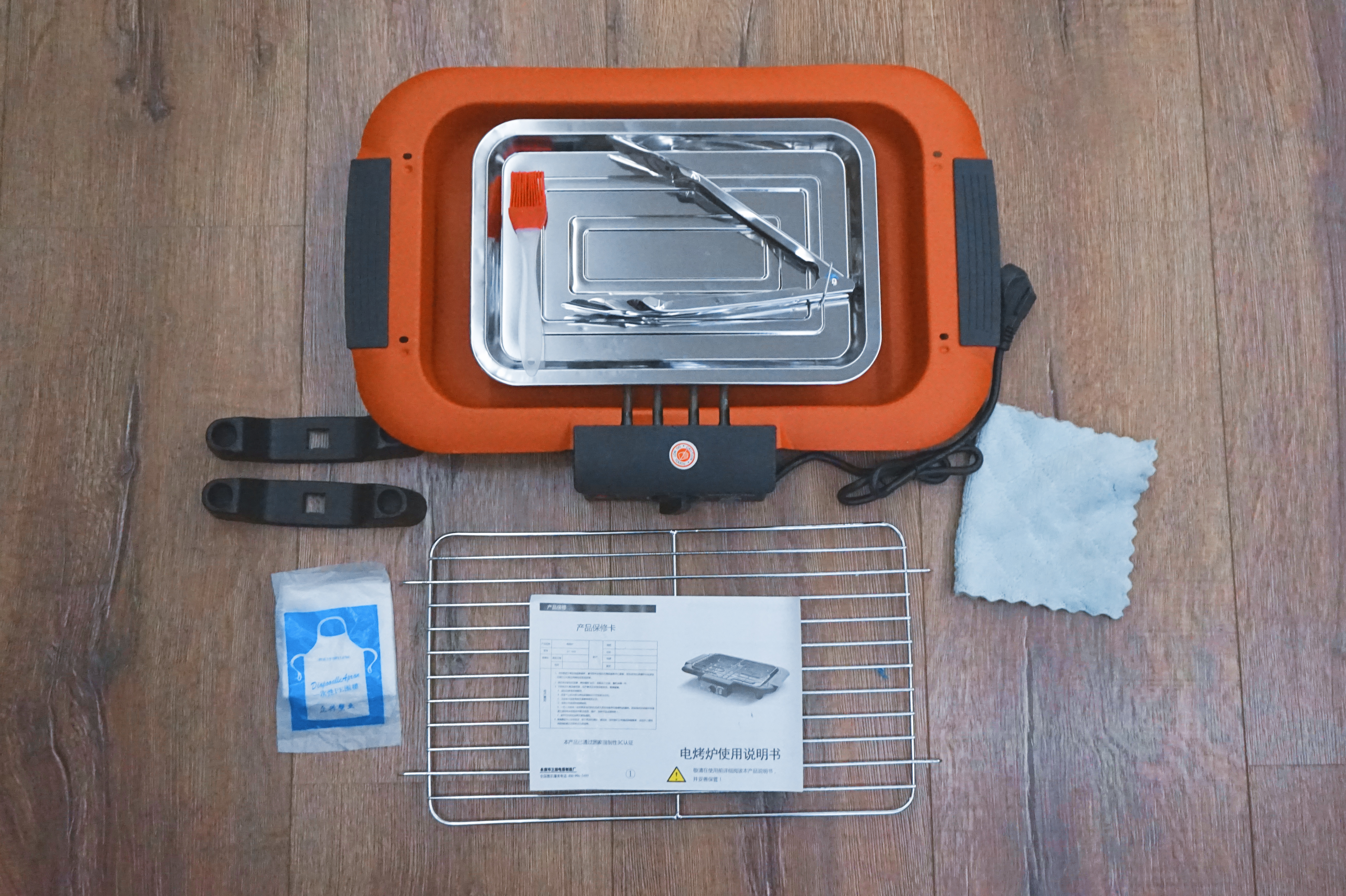 打开包装可以看到除了烤炉还附带了托盘、夹子、烤架以及抹布和一次性围裙。