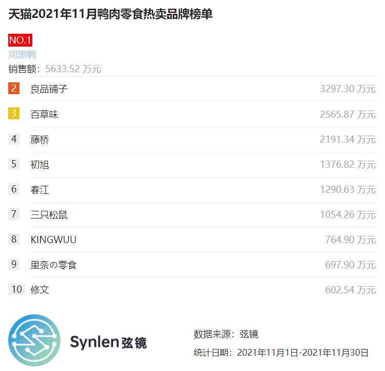根据电商数据搜索工具——“弦镜”数据显示,天猫平台11月鸭肉零食热卖品牌榜单,第一名周黑鸭,销售额为5633.52万元。第二名良品铺子,销售额为3297.30万元。第三名百草味,销售额为2565.87万元。从第四名到第十名分别为藤桥、初旭、春江、三只松鼠、KINGWUU、里奈の零食、修文。