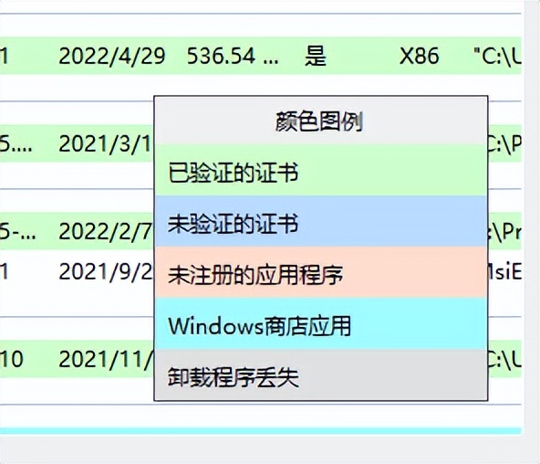 眼尖的差友们应该发现了,这些软件们背后都有一个背景颜色,这些颜色分别代表了:已注册的证书、未验证的证书、未注册的应用程序以及 windows 商店应用。