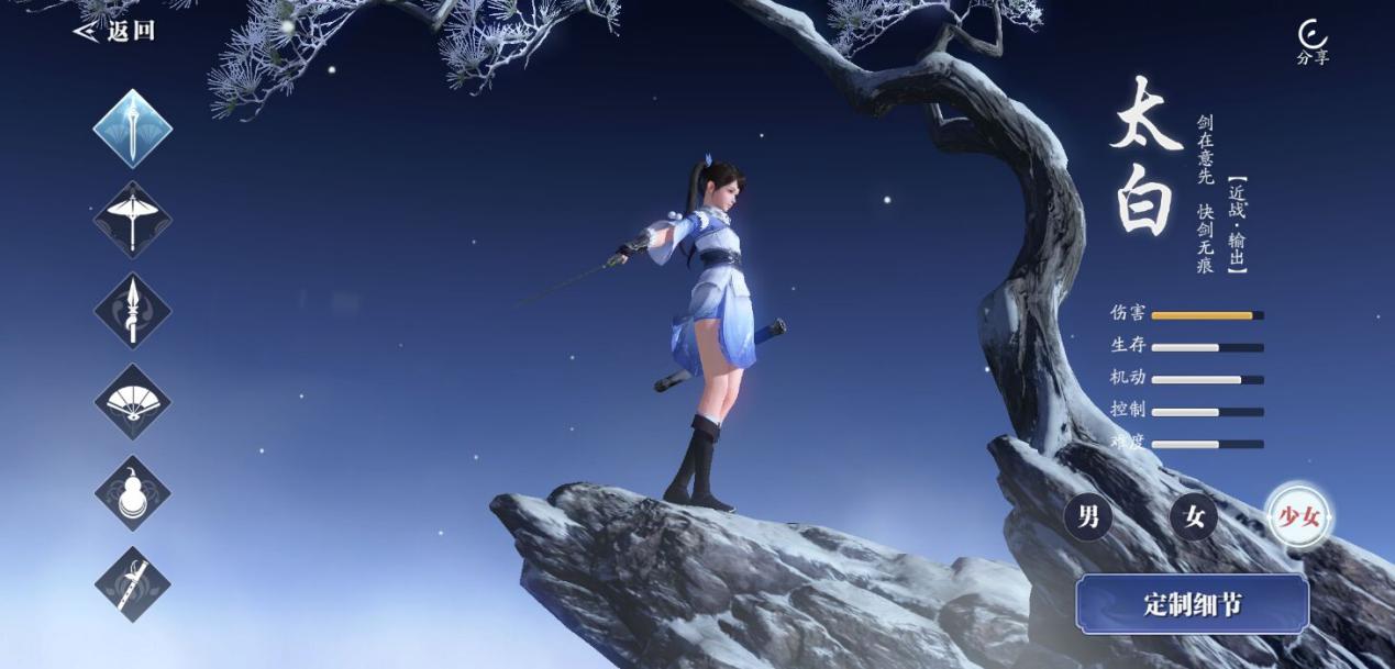 太白的平衡度可以说是天刀手游中最高的了,并且伤害非常突出,属于一个输出类的职业。天涯明月刀手游中,各门派都有两套技能,让他们在不同的场景中能将伤害打满,太白就是这样。太白这个门派在PVP竞技时非常厉害,因为独特的技能机制让他在PVP时占尽优势,虽然PVE太白也不是很差,但是相比唐门这类纯打本类的输出职业,还是差了很多,不过太白打本的能力还是非常不错的。