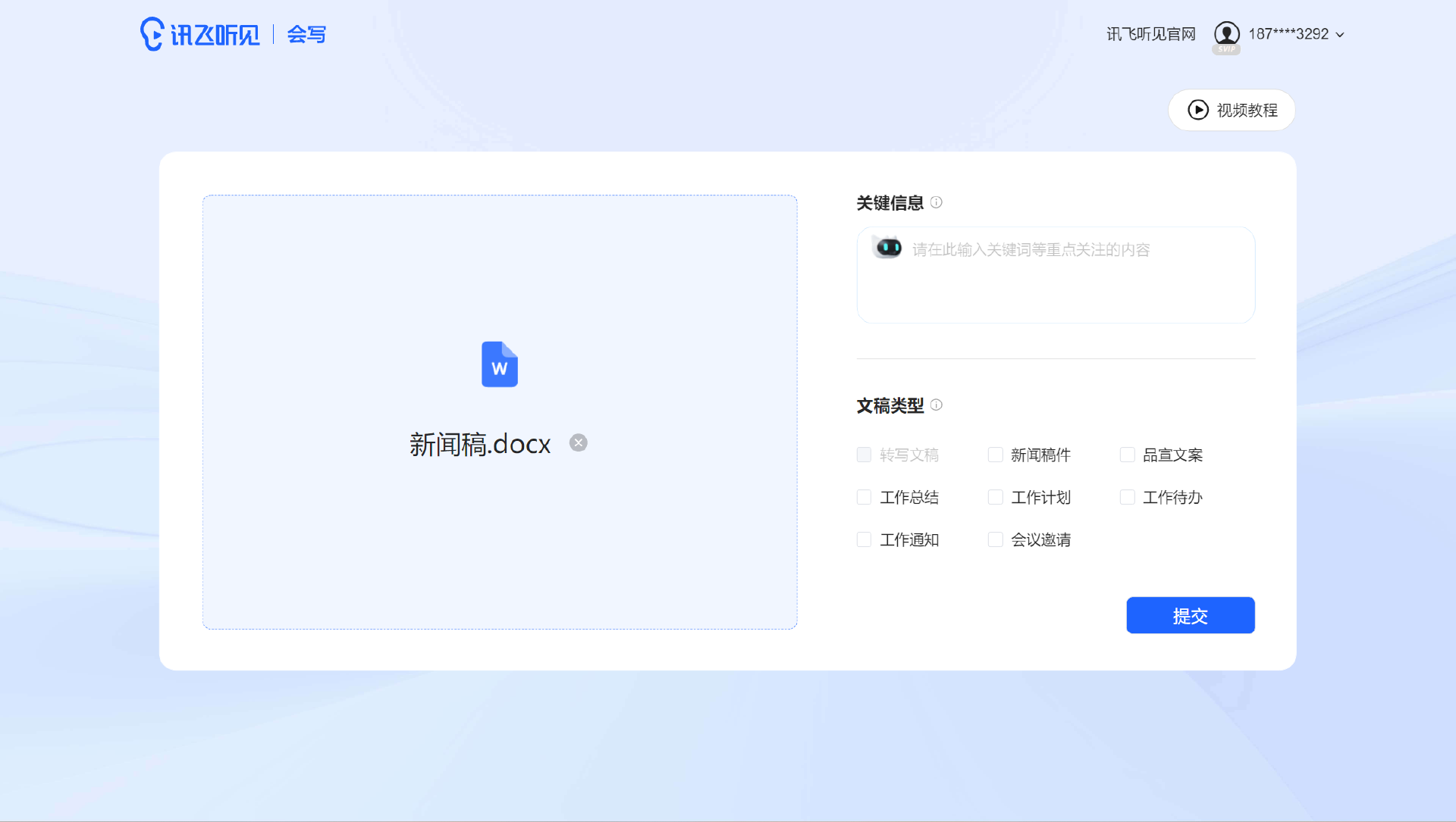 讯飞听见会写的操作界面非常简约、高效。我们只需将需要整理的音视频文稿等文件添加或拖拽至制定框内,勾选右侧文稿类型及关键信息,便可以准确地完成稿件导入,然后根据操作界面进行创作。