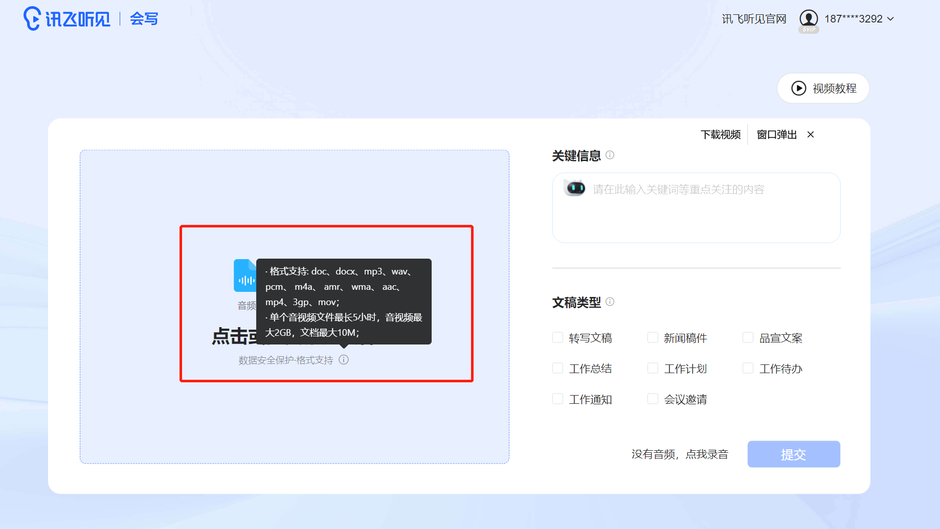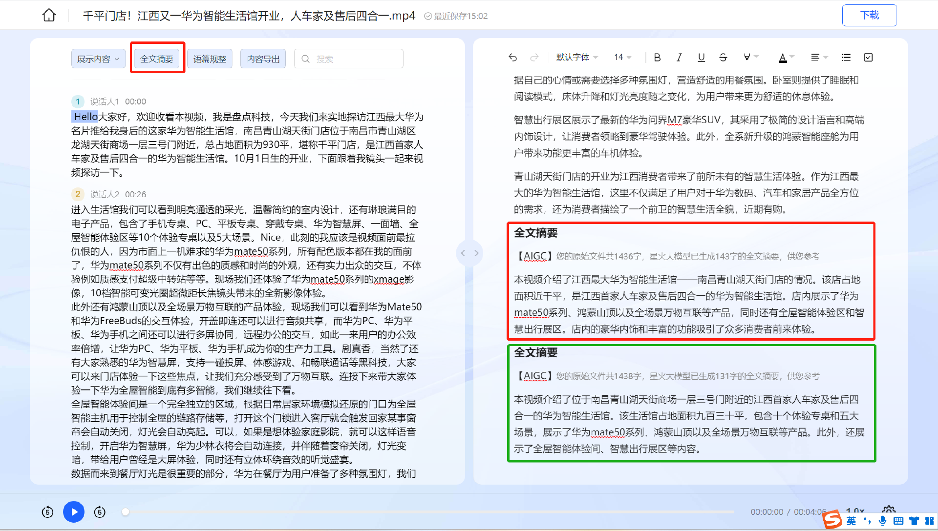 讯飞听见会写支持长达5小时的音频AI处理,并支持多种文件格式上传及导出10种AI内容。上传速度非常快,我尝试上传300兆视频,大约一分钟就完成。内容分析转文稿大约需要两分钟,当然了这与网络环境、以及内容的语料复杂性也是有关系的,如果在公司高速网络下,速度可能会更快。转写同时可以直接对文件内容AIGC提取,支持连续对话AIGC,不受限制设备,使用网页即可。