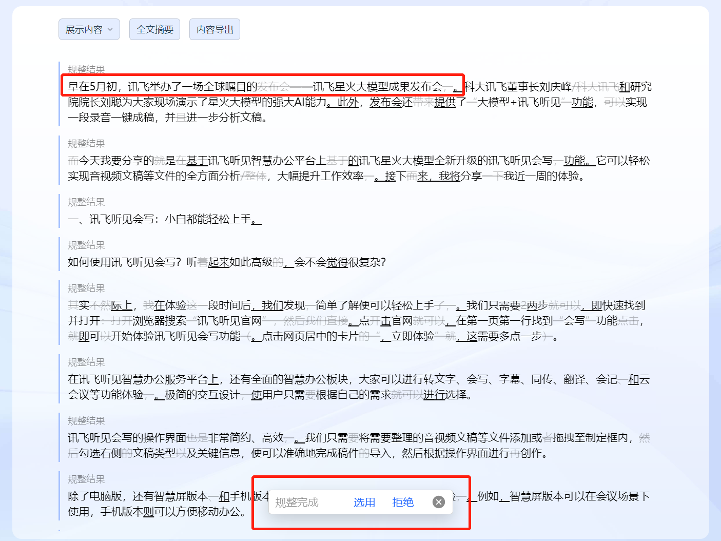语篇规整功能非常强大,这是实测过程中让我印象最深刻的一项功能,堪称废话检测神器。我们都知道中华文字博大精深,错别字、语病、措辞不准确是写文章常见的通病,有些话可能没必要,但会被不经意放进去。如果将这些问题整合在一篇文稿中,修改起来会很费劲,但讯飞听见会写一键轻松搞定,就这么简单。我查看了修改部分,不得不说水平很高,对于一些废话都可以精准修改并找到恰当的措辞或语句替换,对于语病也能精准识别并修正,这放在学校估计就是一个一目十行的高级语文老师了吧?