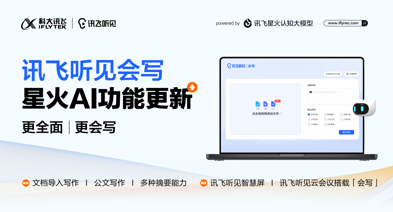 在兼容性方面,讯飞听见会写支持多格式,不受限于原有音频转写限制和文档导入等,更方便用户。此外,云会议、智慧屏和麦克风M2都已搭载会写功能,多终端协同体验满足更多场景需求。