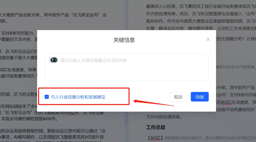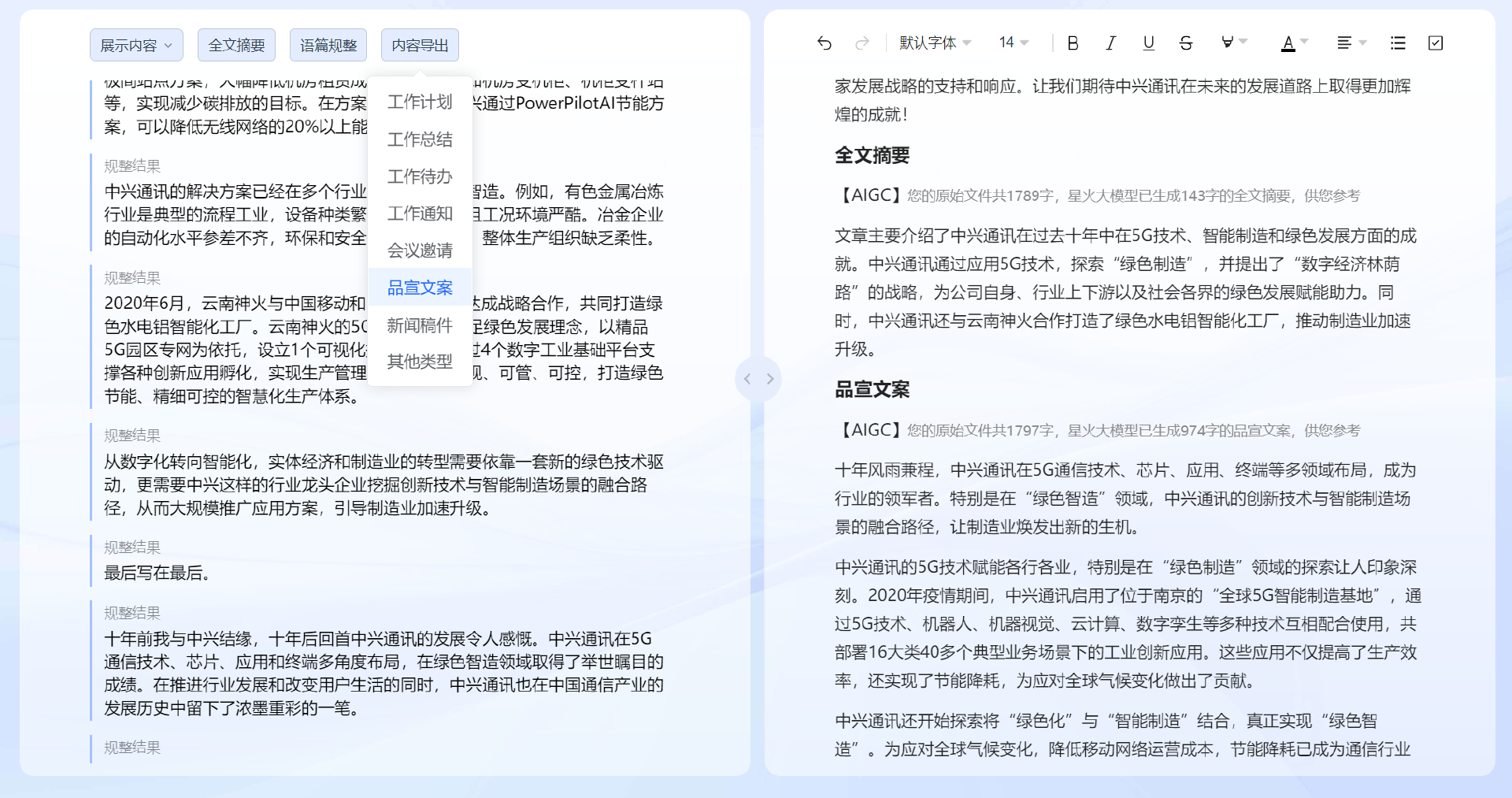 功能栏主要包括三大功能:全文摘要、语篇规整、内容导出。其中内容导出细分了多个工作文稿类型,包括工作计划、工作总结、工作待办、工作通知、会议邀请、品宣文案、新闻稿件以及其他类型。