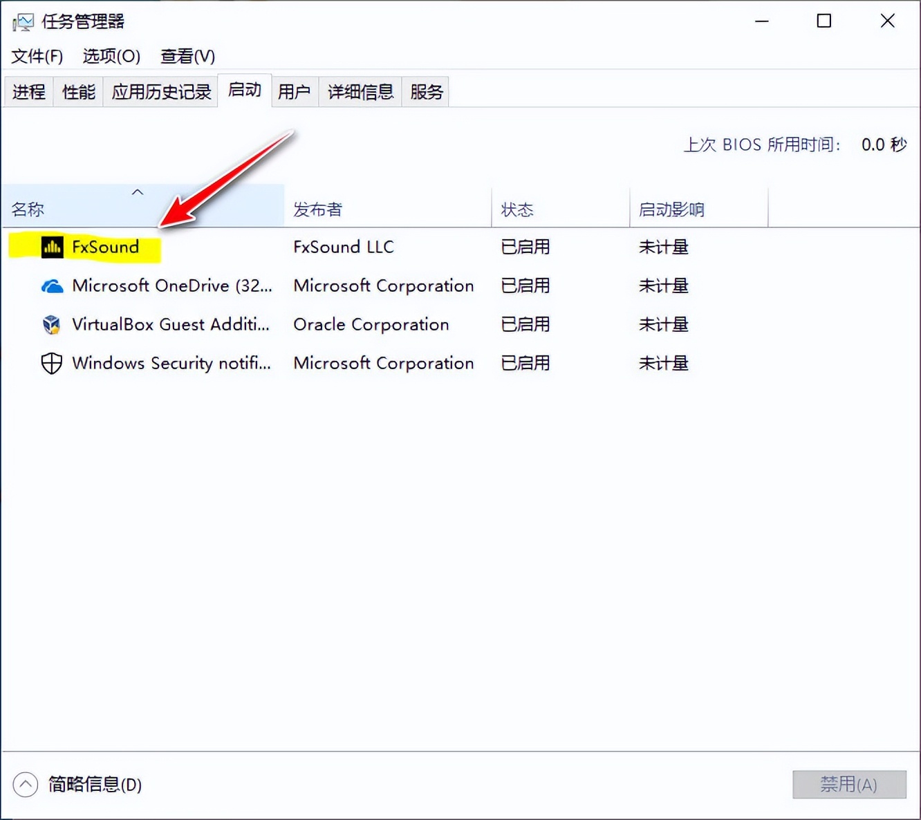 在 任务管理器 中的 启动 选项卡中,我们可以看到 FxSound 静静地躺在启动项里面。