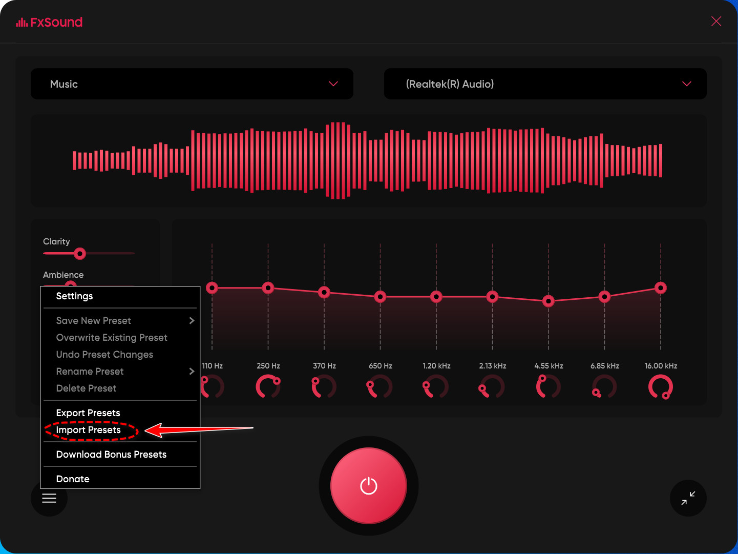 然后打开 FxSound 菜单,点选 Import Presets 准备导入预设。