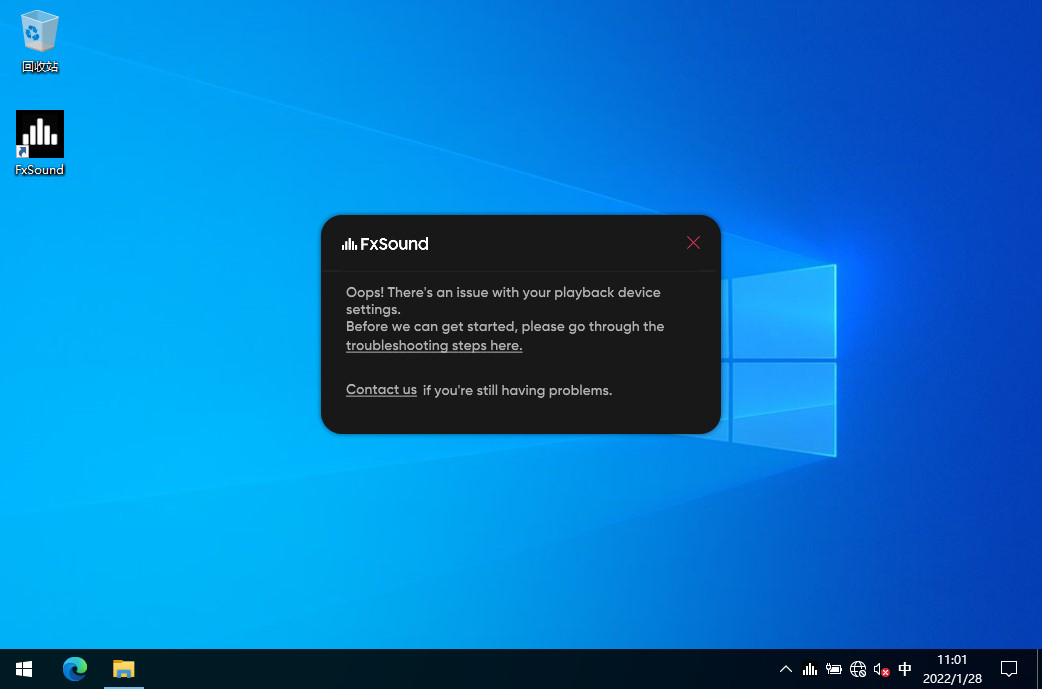 请小心,当你确定你的声卡还在的时候,遇到下面的警告提示后,最好重新安装一次 FxSound 再试试。