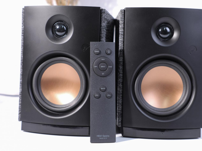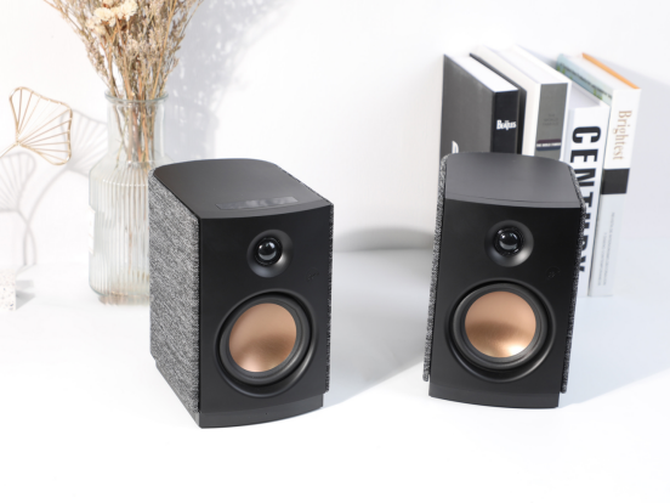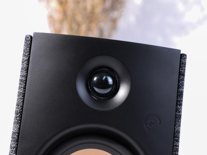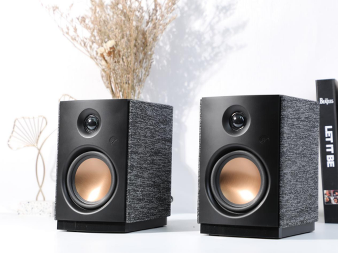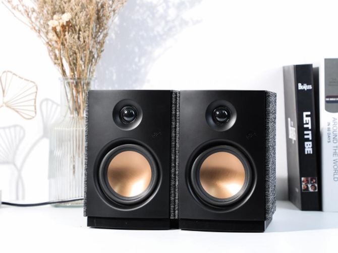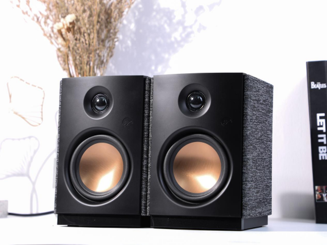 音箱整体采用了非常时尚简单的外观设计,正面的黑色装饰板配合上金色涂装的中低音单元,整个正面看上去非常地抢眼,尤其那一抹金色,让人眼前一亮,而音箱的侧面和后部则是采用了定制的灰白相间的无缝编制网布,这与惠威一贯的原木侧板相比较,则更显时尚。
