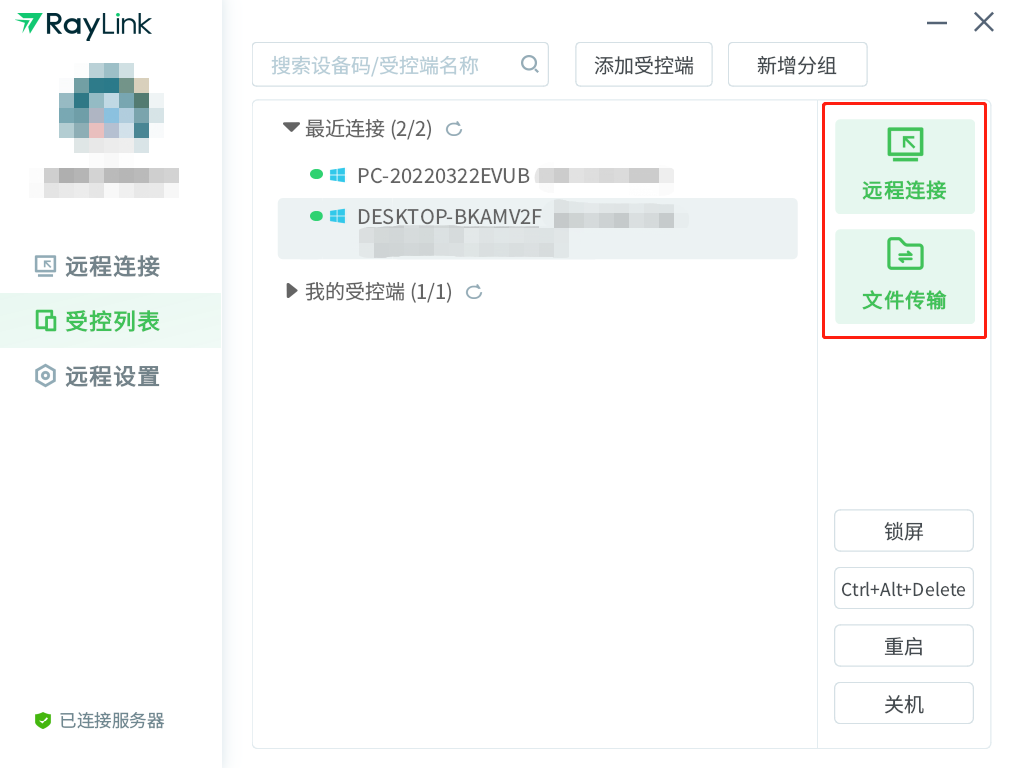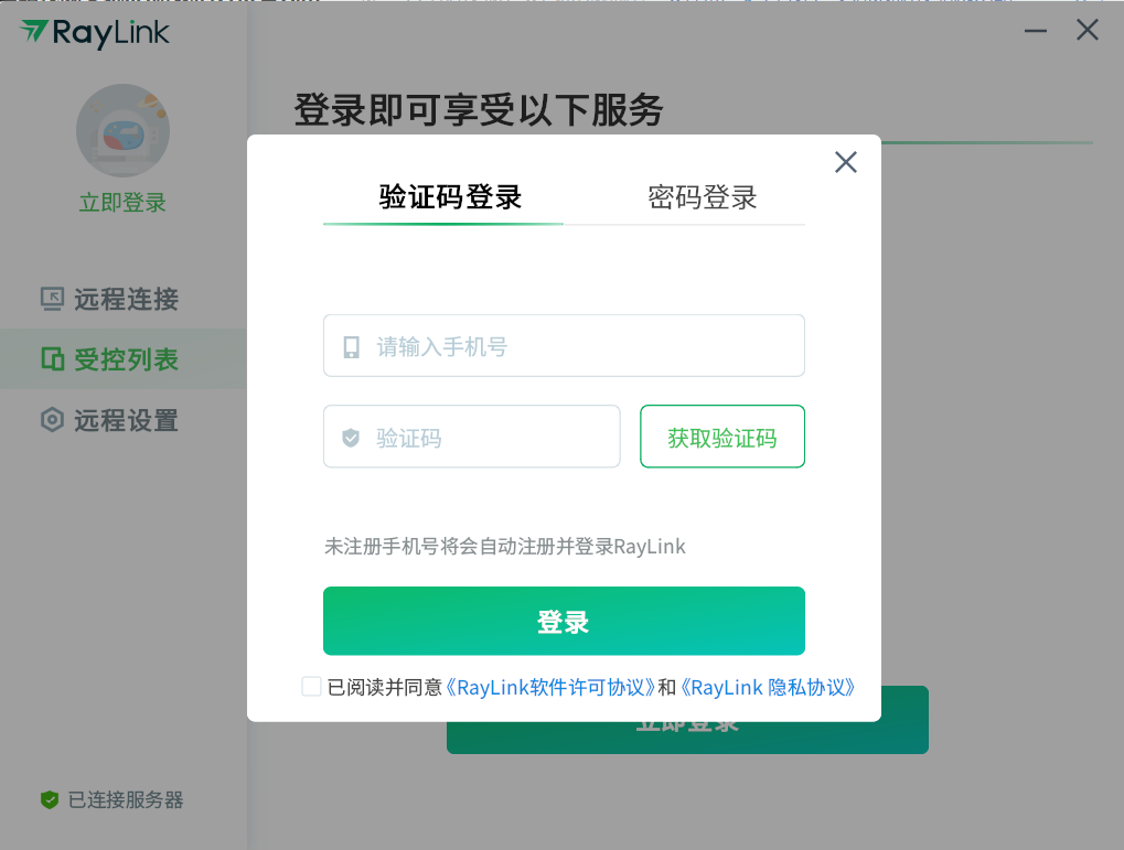RayLink 的登录方式也比较单一,只有「验证码登录」和「密码登录」这两种,无法使用常见的微信扫码进行登录。RayLink的功能也非常的少,除了远程连接只有文件传输这个功能,无法满足其他更高需求的远程场景。