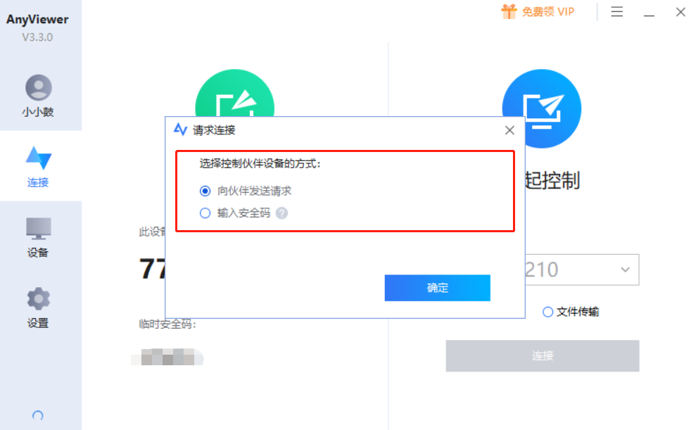 不过跟其他远控相比,它在连接时也有着自己的优势,连接设备的方式有「向伙伴发送请求」和「输入安全码」,适用于不同场景下的远程连接。