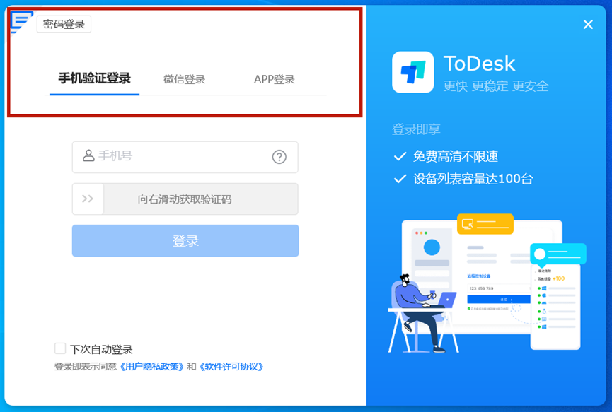 而在实际使用的过程中,我也能感受到ToDesk很强的功能性与体验感。操作很简单,跟其他大多数软件的使用逻辑差不多,需要在电脑上安装ToDesk,不过若是发起远程连接,其他被控电脑同样需要安装ToDesk。下载后先绑定手机号并进行注册登录,绑定手机成功后下次可通过4种方式进行快速登录,我一般都用微信扫码登录,感觉更方便。