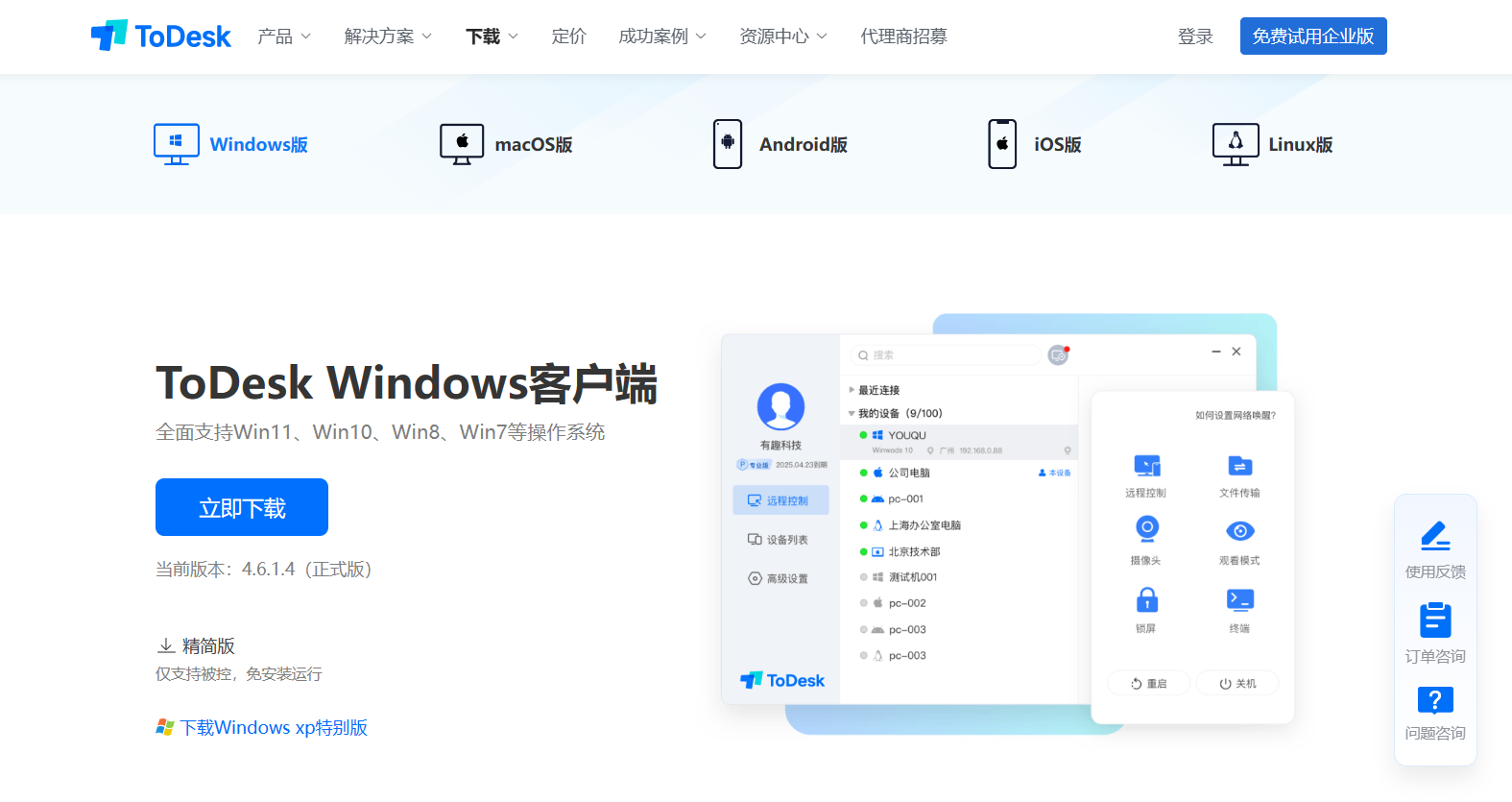 ToDesk的远程功能配置也意外的丰富齐全,不仅支持Windows、Android、iOS、macOS、Linux等五大主流系统的使用,而且什么远程传输文件、远程投屏、远程摄像头、远程打印、远程开关机等等功能都一应俱全,这次测试后我就经常用ToDesk的很多功能来办公和应急,非常实用。要是要求再高一点,ToDesk还有针对企业团队使用的企业版,那更是能解决上百号人的远程操作,这样的配置我真的有点不敢相信ToDesk才上线不到3年,简直发展的太全面了点。