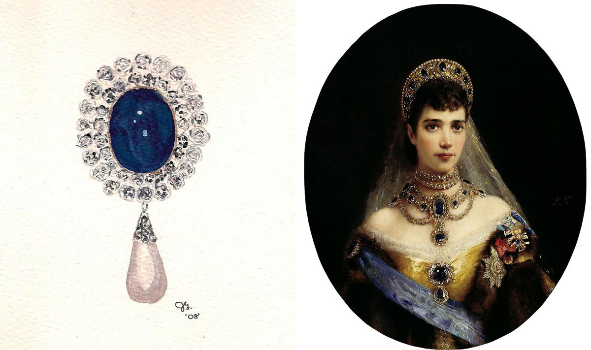 最后要说的这件蓝宝石珠宝也很特别,它和蓝宝石王冠一样,最初也不属于英国王室,而是属于他们的亲戚——亚历山德拉王后的妹妹、俄国皇后玛丽亚·费奥多罗芙娜,是亚历山德拉送给妹妹的结婚礼物之一。