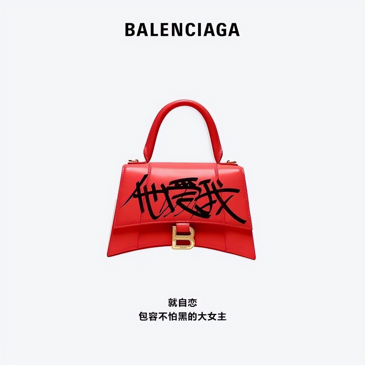 巴黎世家的知名设计师手绘了“他爱我”、“我爱我”、“我爱你”、“你爱我”等涂鸦到沙漏包上,设计理念是想表达每一只包都是独一无二的,象征着每一份爱情都是独一无二的。