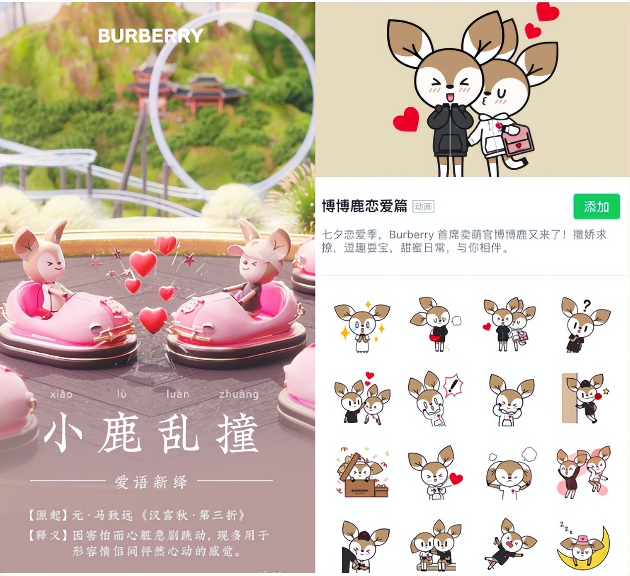 去年七夕,奢侈品牌Burberry除了推出七夕主题的限定系列服饰,以及心形图案的全新主视觉外,还邀请首席卖萌官博博鹿出镜,完美演绎重释了「小鹿乱撞」、「心有灵犀」、「比翼双飞」等关于爱情的中国成语,并开发上线了「博博鹿恋爱篇」表情包,渲染了品牌七夕的甜蜜氛围。