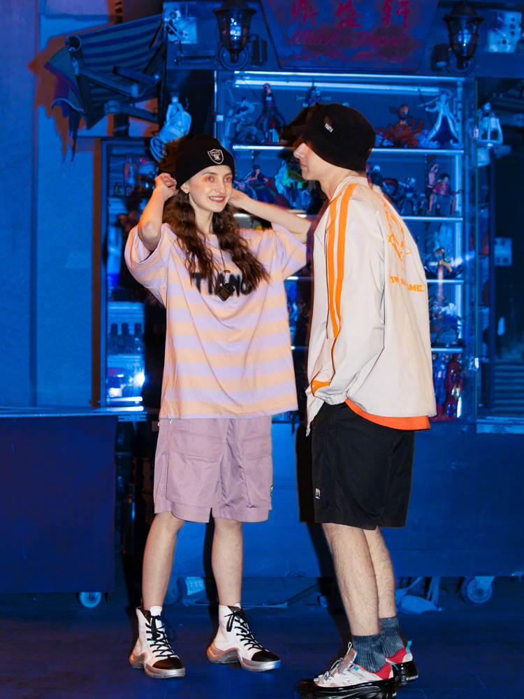 对于那些酷酷的男孩女孩,READY PLAYER ONE系列就是个不错的选择,简约宽松的服饰更具嘻哈感,以紫色和橙色为主的条纹T恤,配色就比较淡雅了,搭配上一条香芋紫的工装短裤和高腰帆布鞋,潇洒帅气,完全呈现一种cool女孩的即视感,还有胸前手绘撞色TIANC图案,是品牌的象征也是个性的展现。