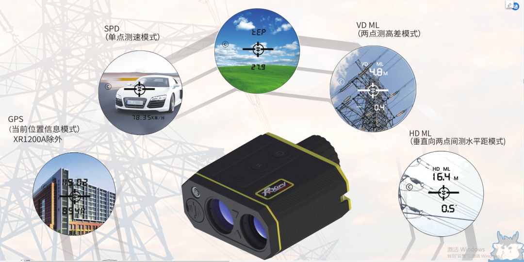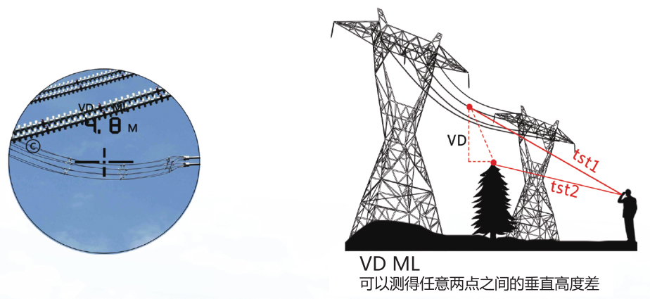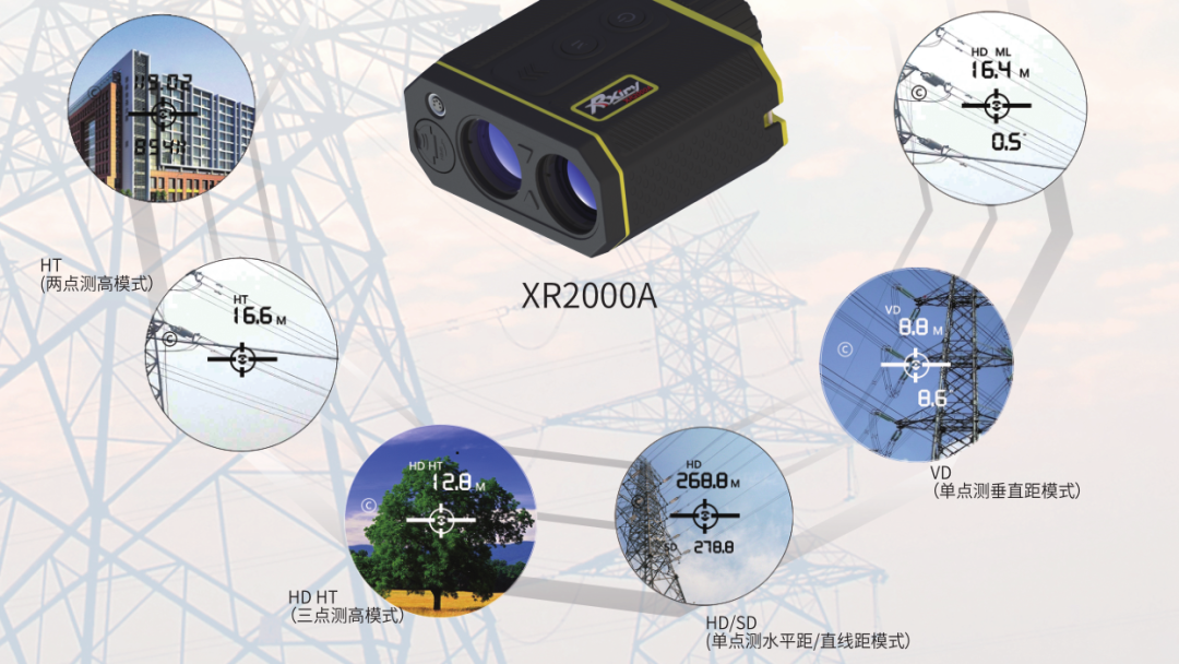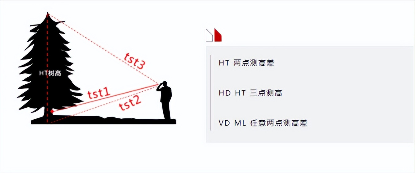 针对不同的测高需求分为:两点测高(适用于建筑物类)、三点测高(适用于树木类)、任意两点测高度差(适用于线缆高度),测距时更是针对同一个垂直面内前方两个目标间的直接数据进行简化测量。