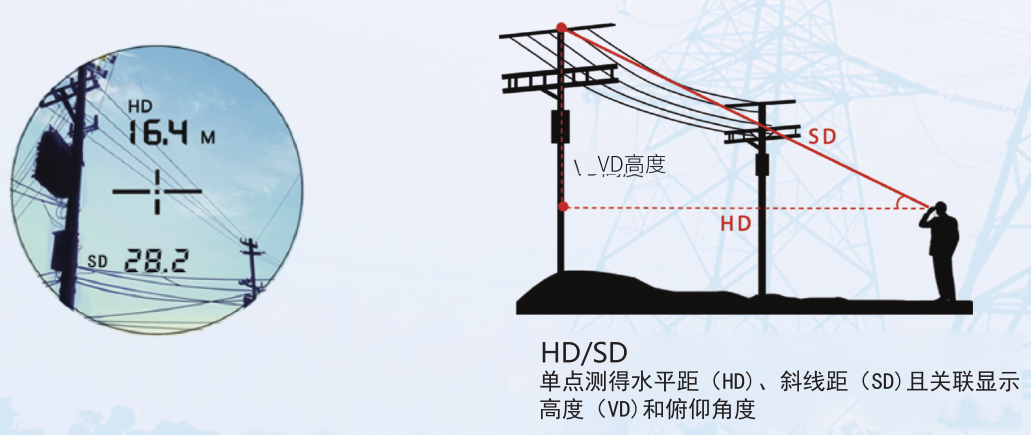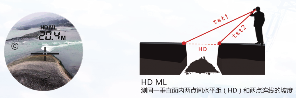 该功能模式可同时显示所测量目标点的水平距离和斜距数值。
