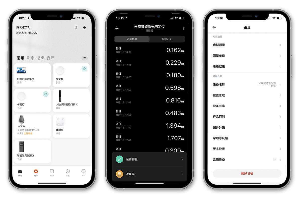 测距仪接入了小米生态系统,「米家」APP中可以直接添加,点击智能激光测距仪的图标,就能进入到管理页面。