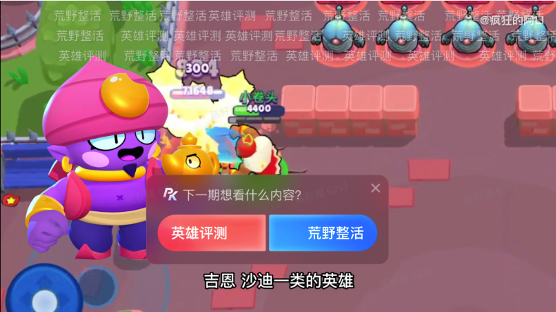 视频中对游戏【荒野乱斗】中的几名角色进行了评测,为了能够了解观众的喜爱,作者在文章结尾添加了PK贴纸,让观众选择下期想看什么内容。
