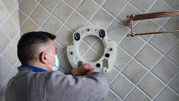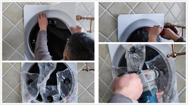 确认好位置后,安装师傅就开始贴打孔得位置图了,先是瓷砖开孔,然后是电锤打孔,这里小吉还配了打孔时接灰的袋子,打孔时可以让泥灰都进袋子里,省去了我们打扫卫生的大把精力。