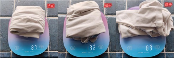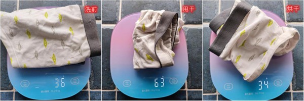 另外,烘干效果确实令人欣喜,清洗后烘干的重量每种材质的内衣裤都要比原先的轻,水分是基本被排干了,这个干燥程度感觉要比太阳下晾干都要好很多,而且棉质内衣裤也没有缩小,更加呵护衣物。