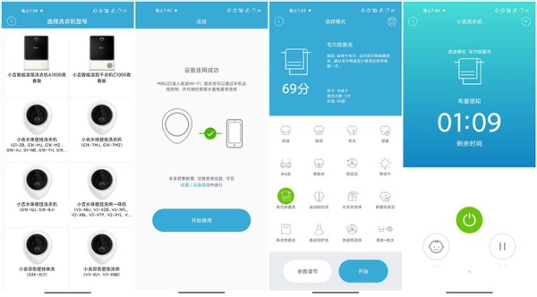 我买的V2-XW洗烘脱一体壁挂洗衣机使用的小吉科技APP,连接还是比较简单,通过APP选择对应的型号,然后按提示连接,很快就联网成功了。这个时候,就可以看到APP内置的18种洗烘模式了。每种洗涤模式机子都会根据衣物的重量来自动判断洗涤时间,这点还是非常智能的。洗涤完成后,也会通过手机APP来提醒,机子上也会有音乐声提醒。
