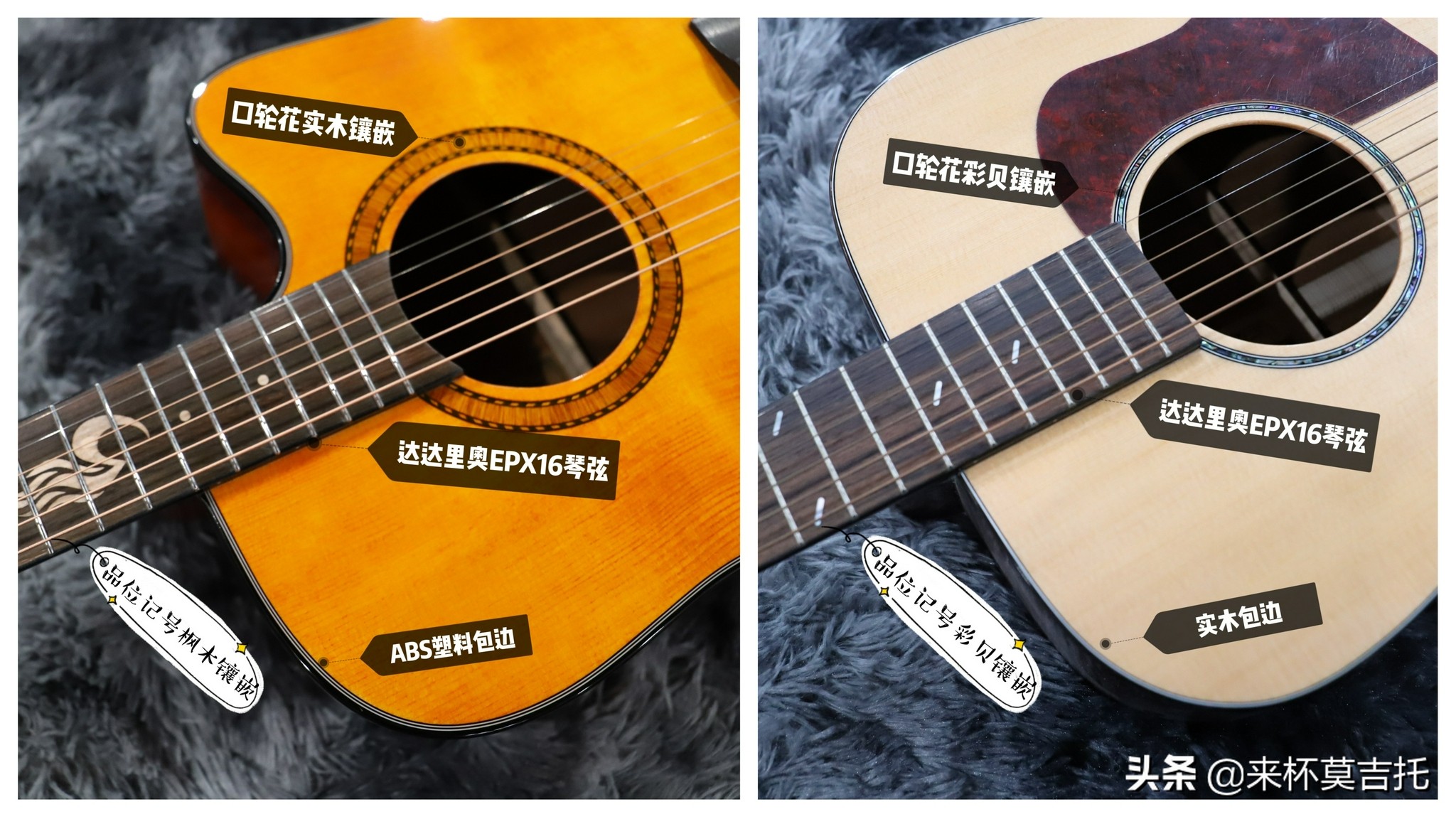 口轮花处,布鲁克S25用的实木镶嵌,VEAZEN VZ90系列是精致的实木包边;品位记号,布鲁克S25是枫木镶嵌,VEAZEN 90系列则是彩贝镶嵌。彩贝的成本更高,质感更高,外观更惊艳,所以彩贝镶嵌用在中高端木吉他上是很常见的配置,一般入门的面单或者全单用实木镶嵌的比较多。